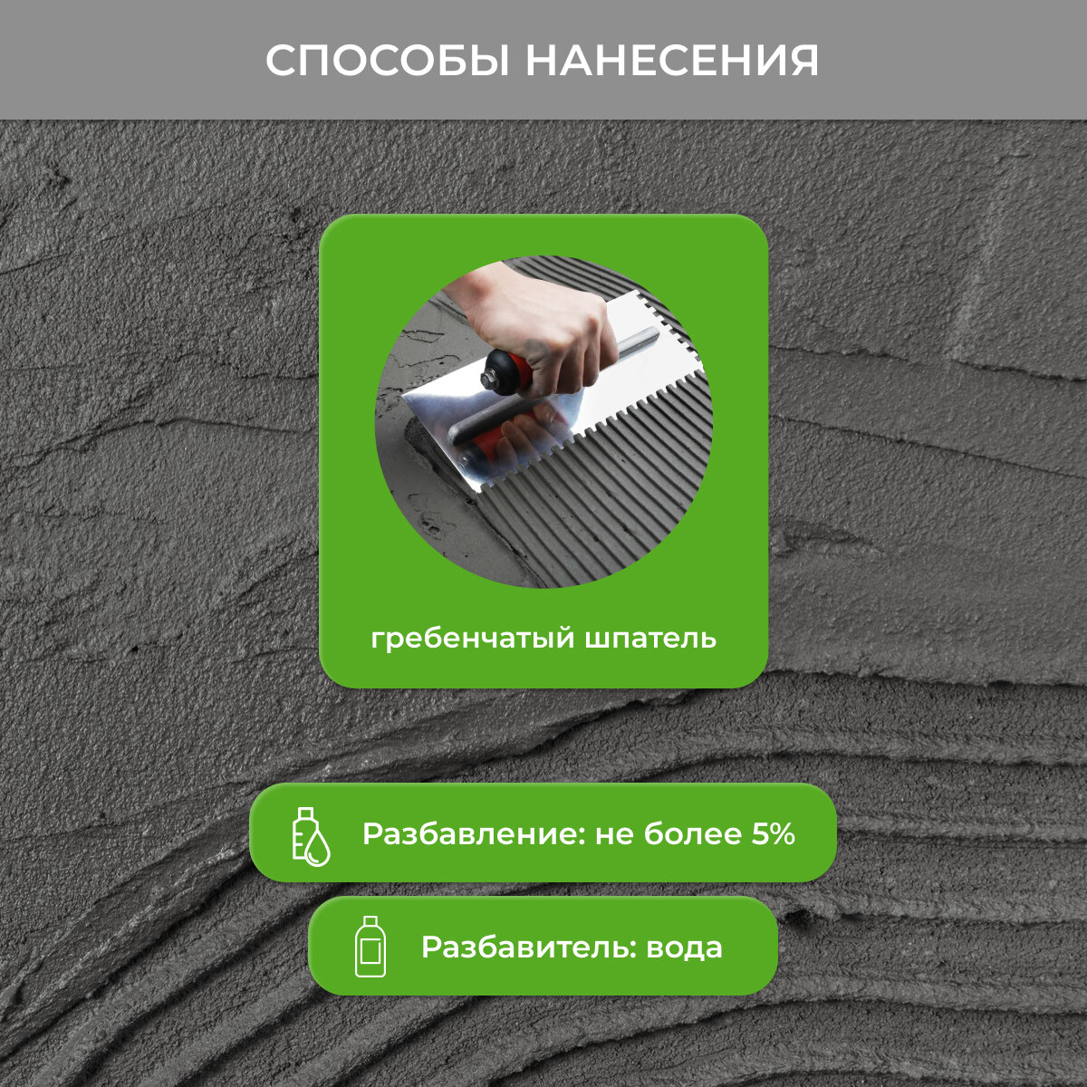 | Дополнительная информация | расход 0,5-1,7 кг/м²; выдерживает 5 циклов замораживания-оттаивания; пожаровзрывобезопасна; состав: связующее, инертный наполнитель, модифицирующие добавки |