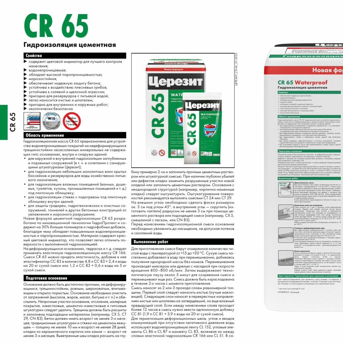 | Дополнительная информация | Может применяться: для наружной и внутренней гидроизоляции заглубленных и подземных сооружений (в т.ч. в сочетании с санирующими штукатурками Ceresit); для гидроизоляции небольших монолитных ванн крытых бассейнов и резервуаров для воды хозяйственно-питьевого назначения; для гидроизоляции влажных помещений (ванных, душевых, туалетов, кухонь, промышленных помещений и т.д.) в т.ч в системе «теплый пол» под плиточную облицовку; для защиты градирен, гидротехнических и очистных сооружений, тоннелей и других бетонных конструкций от увлажнения и морозного разрушения; для заполнения шпуров и пустот при инъектировании кладок старых зданий (см. CO 81). Гидроизоляцию следует защитить от механических повреждений плиточной облицовкой или не содержащими гипс штукатуркой или стяжкой. |