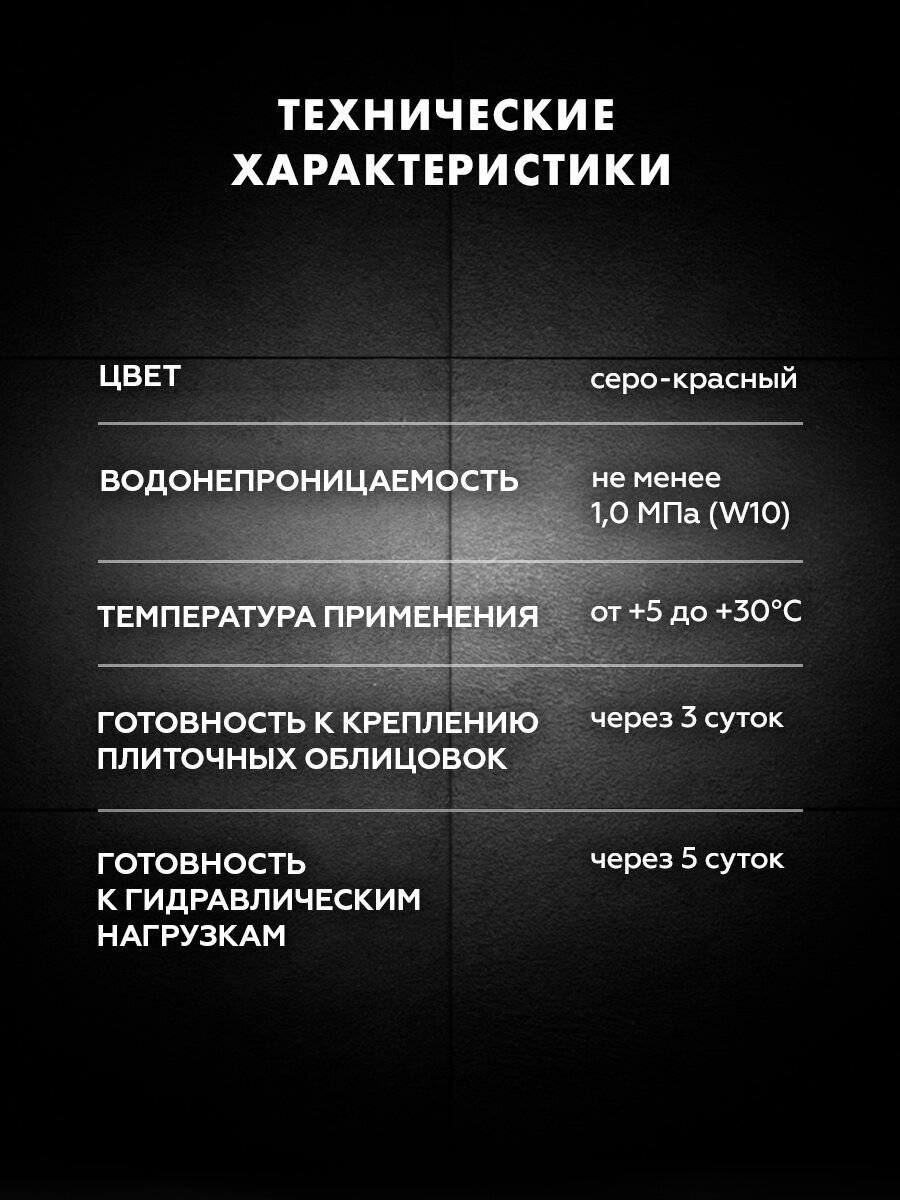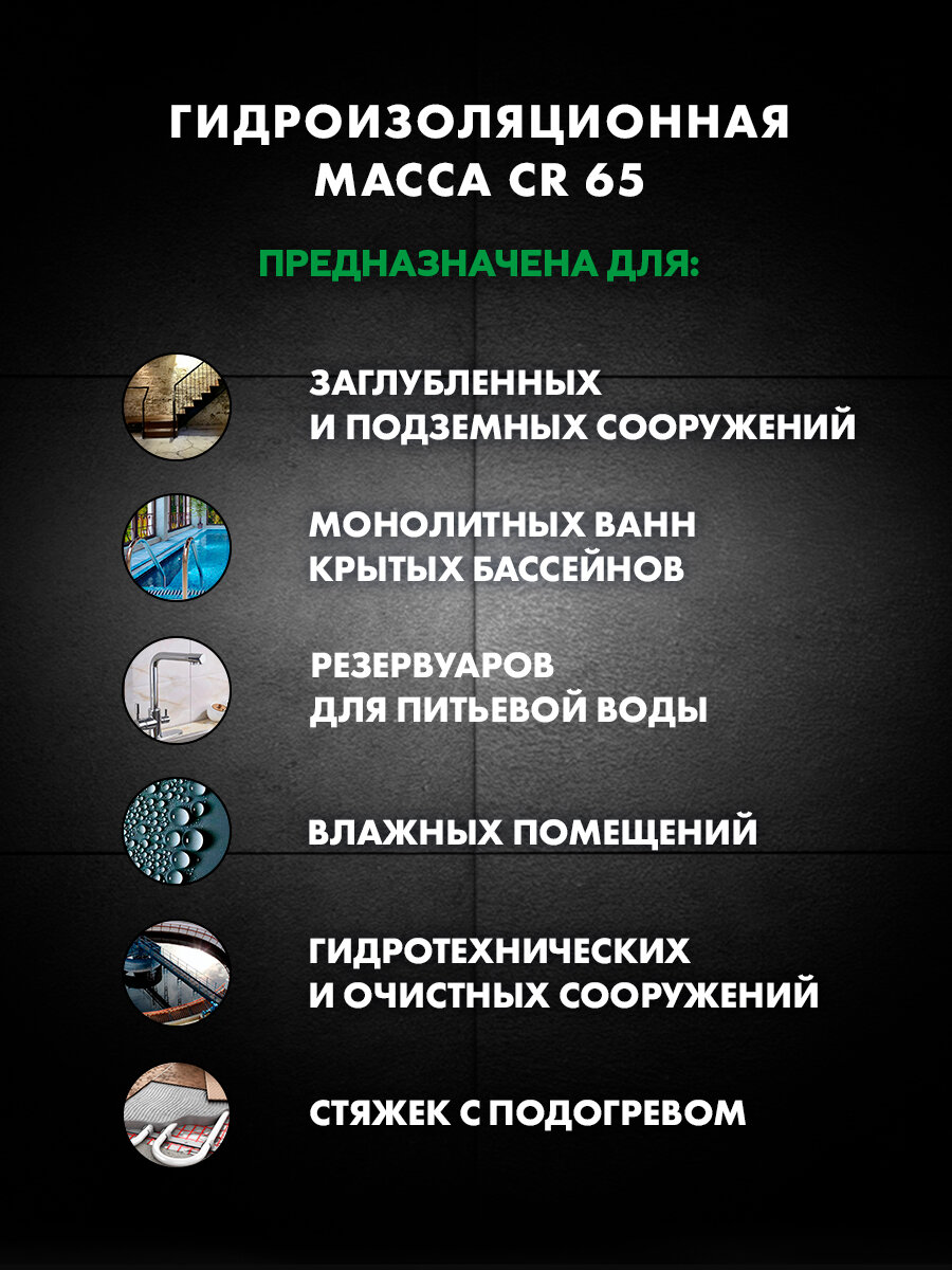 | Дополнительная информация | Может применяться: для наружной и внутренней гидроизоляции заглубленных и подземных сооружений (в т.ч. в сочетании с санирующими штукатурками Ceresit); для гидроизоляции небольших монолитных ванн крытых бассейнов и резервуаров для воды хозяйственно-питьевого назначения; для гидроизоляции влажных помещений (ванных, душевых, туалетов, кухонь, промышленных помещений и т.д.) в т.ч в системе «теплый пол» под плиточную облицовку; для защиты градирен, гидротехнических и очистных сооружений, тоннелей и других бетонных конструкций от увлажнения и морозного разрушения; для заполнения шпуров и пустот при инъектировании кладок старых зданий (см. CO 81). Гидроизоляцию следует защитить от механических повреждений плиточной облицовкой или не содержащими гипс штукатуркой или стяжкой. |