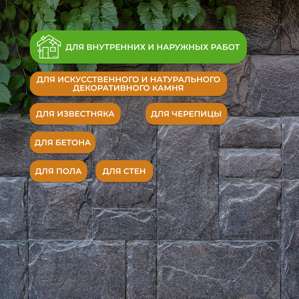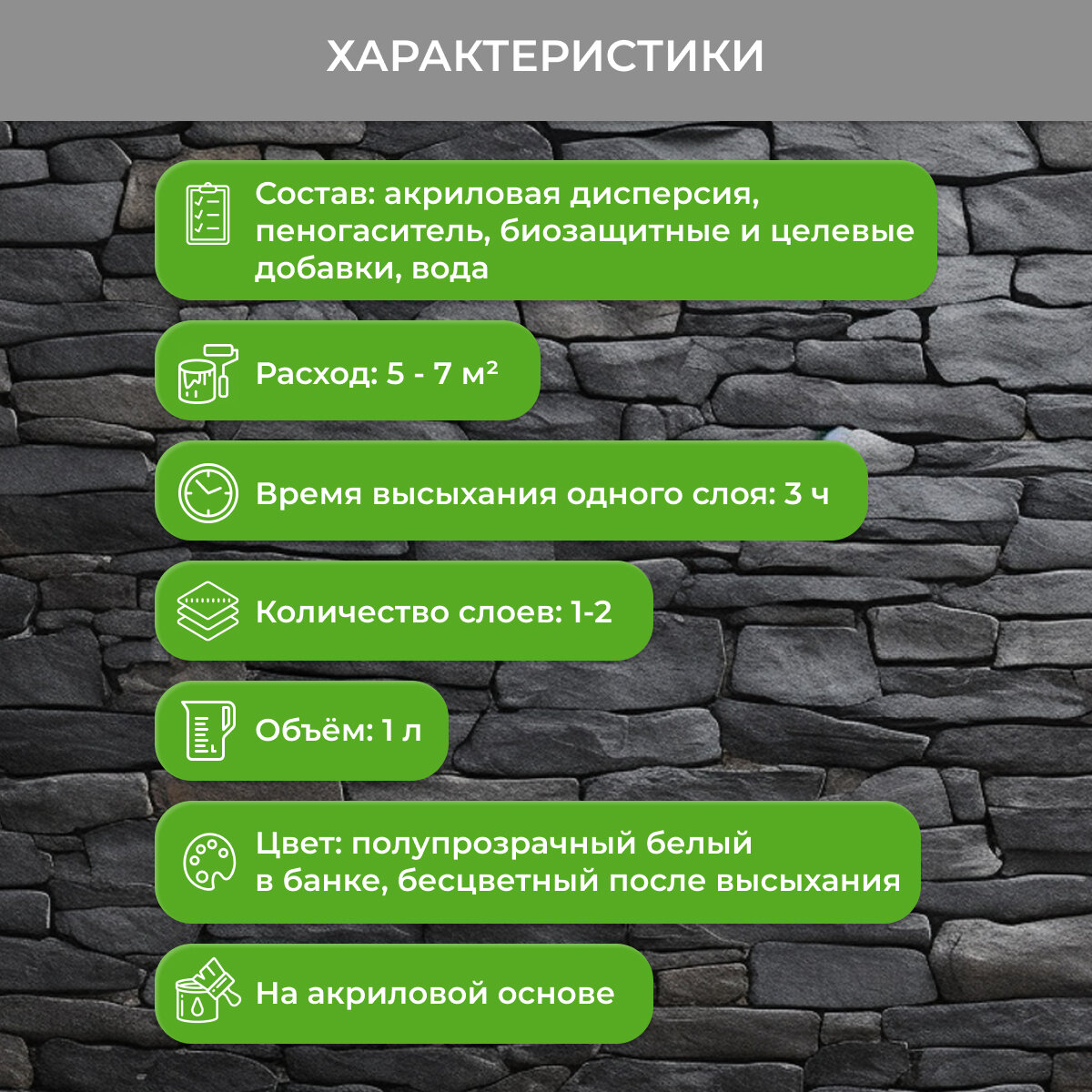 | Особенности | УФ-защита, без запаха, водостойкий, износостойкий, с эффектом мокрого камня, термостойкий |