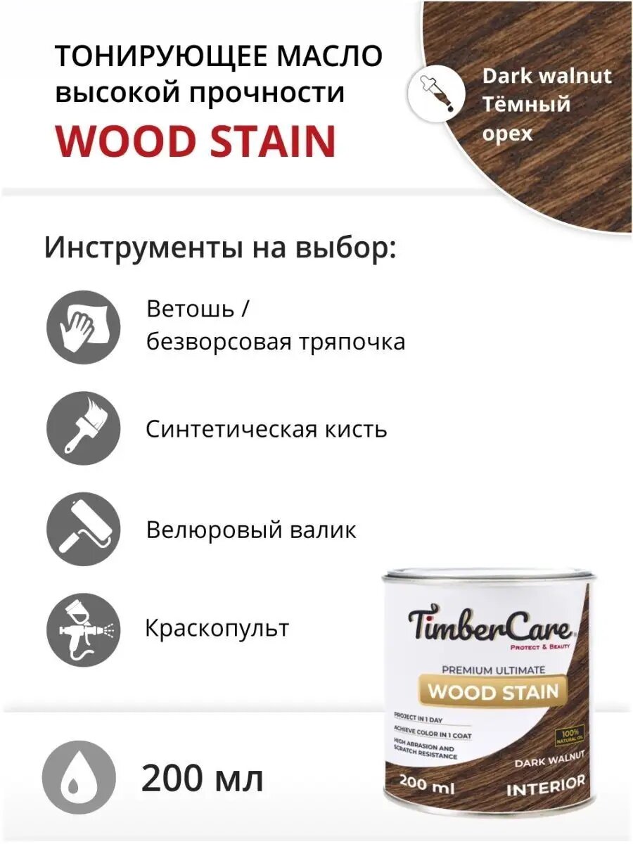Масло для дерева и мебели TimberCare Wood Stain, быстросохнущие масла для дерева для внутренних работ, Темный орех/ Dark Walnut, 0.2 л