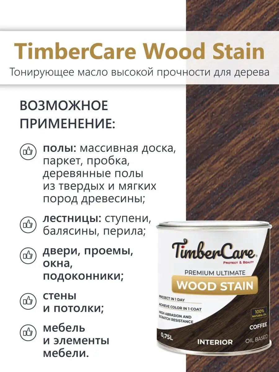 СохранитьТонирующее масло для дерева высокой прочности TimberCare Wood Stain, быстросохнущие масла для дерева и мебели, пропитка для дерева для внутренних работ, тонирующая морилка для мебели Кофе Coffee 0,75л интересное:
