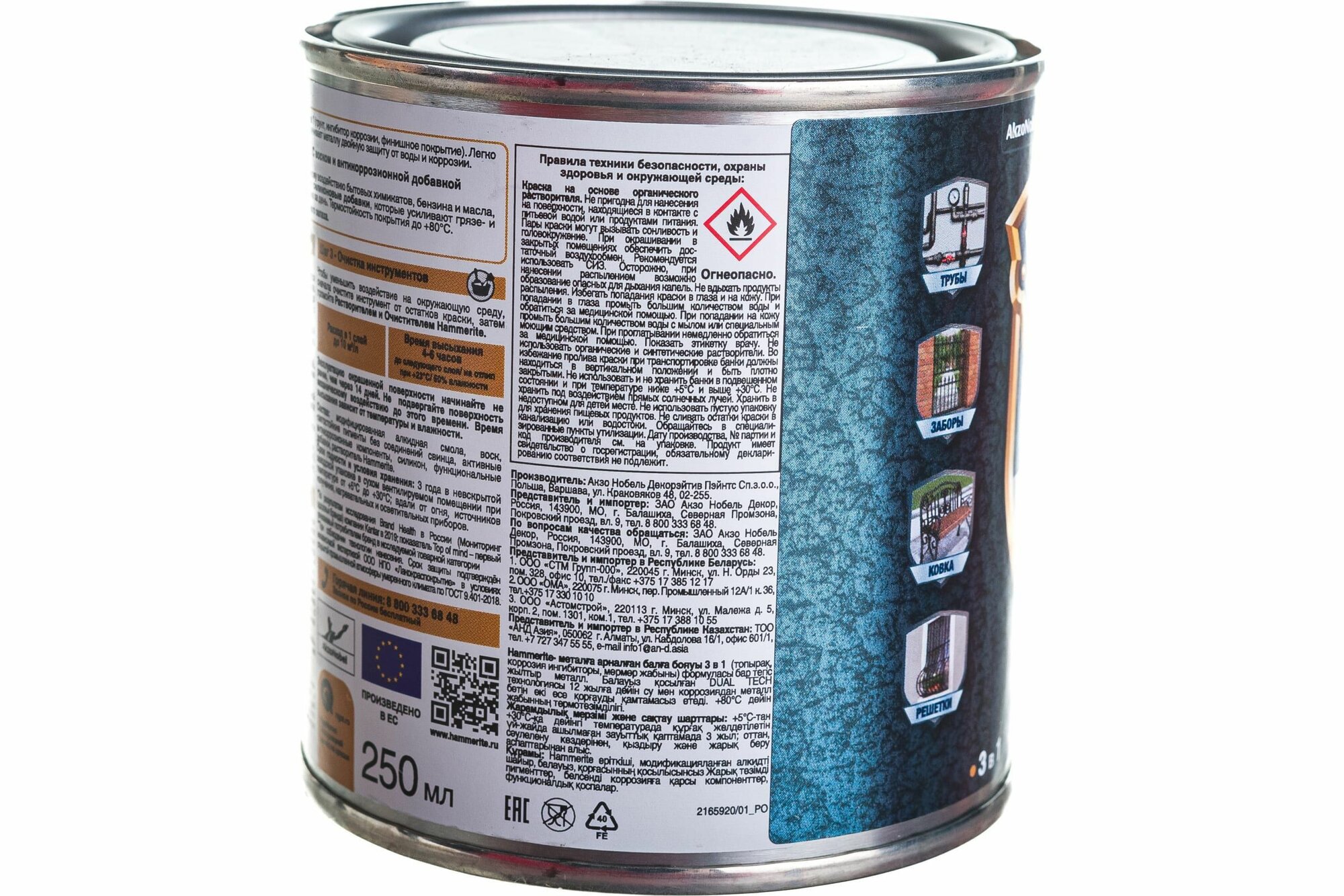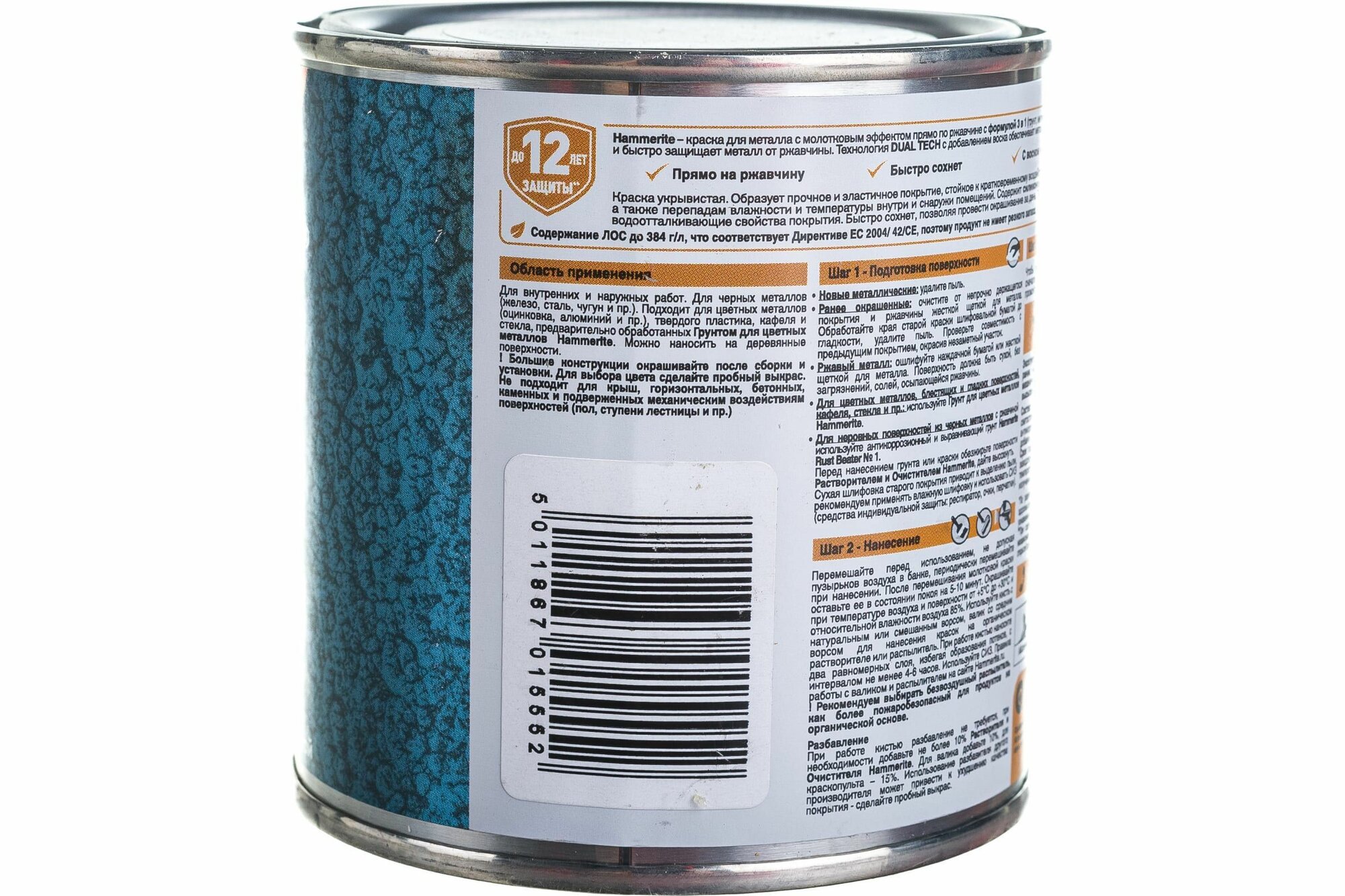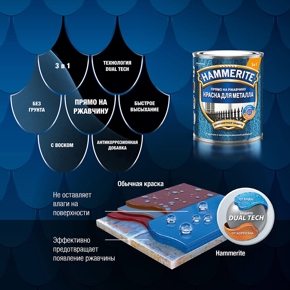 | Дополнительная информация | Краска для металла молотковая прямо по ржавчине с формулой 3 в 1 (грунт, ингибитор коррозии, финишное покрытие) легко и быстро защищает металл от ржавчины, придает красивый внешний вид поверхности. Благодаря технологии DUAL TECH с добавлением воска обеспечивает двойную защиту металлической поверхности от воды и коррозии. - Уникальная формула краски 3 в 1. Прямо на ржавчину. - Долговечная защита металла - Образует атмосферостойкое покрытие с грязе- и водоотталкивающими свойствами - Технология Dual Tech — только в Hammerite - Обладает отличной укрывистостью и адгезией (способность к прочному сцеплению) к ржавой поверхности |
