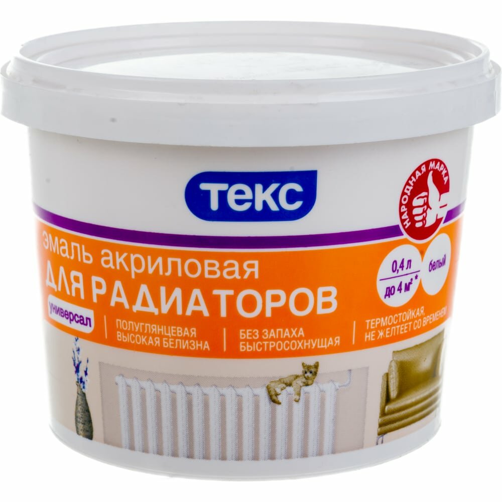 Купить Эмаль акриловая для радиаторов Текс Универсал, полуглянцевая, белая, 0,4 л
