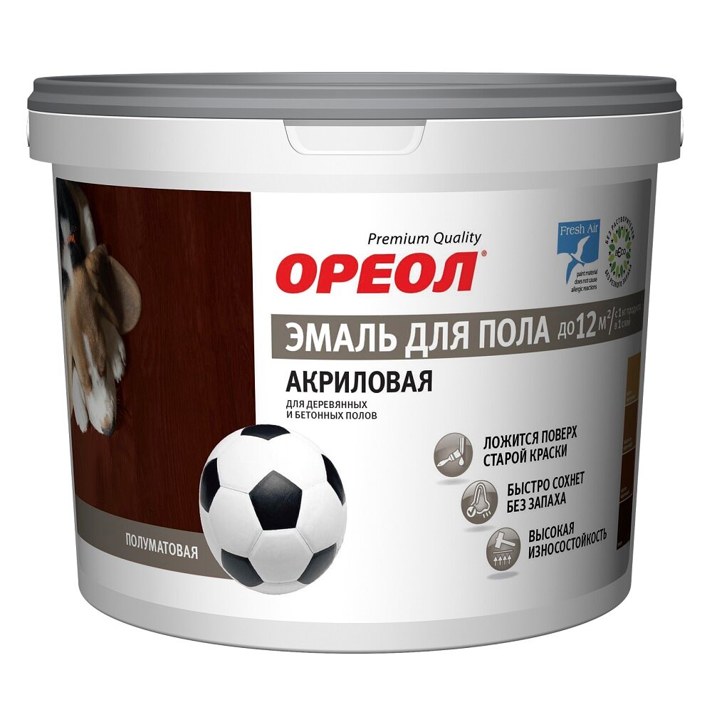 Эмаль Ореол, для пола, быстросохнущая, акриловая, полуматовая, красно-коричневая, 2.3 кг