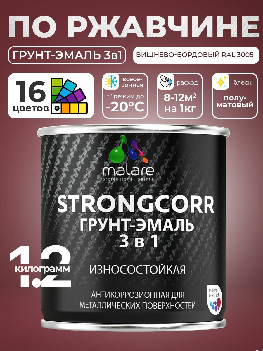 Купить Грунт-Эмаль Malare 3 в 1 для металлических поверхностей, краска для металла, износостойкая, полуматовая, RAL 3005, вишнево-бордовый, 1.2 кг.