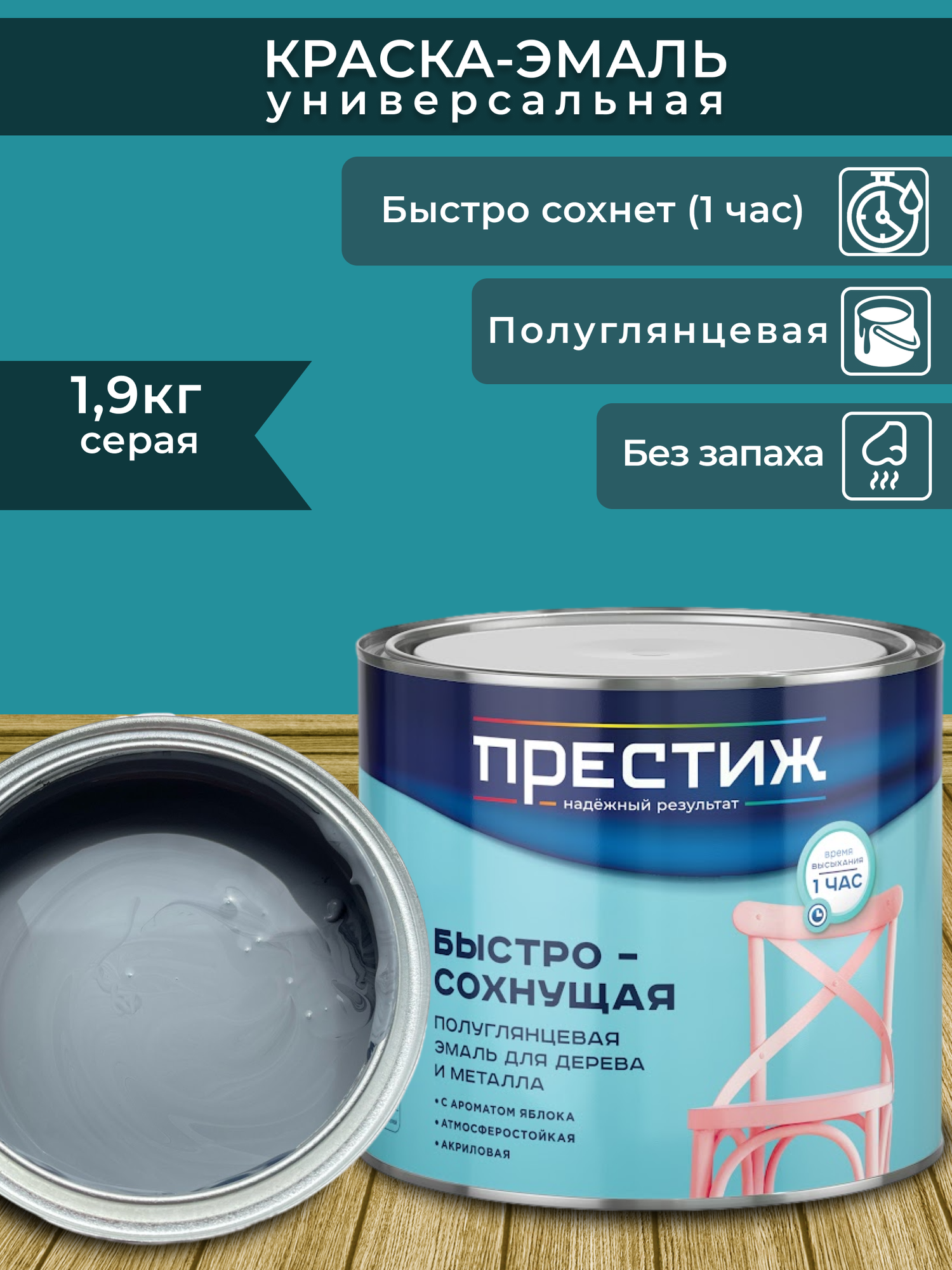 Эмаль быстросохнущая для дерева и металла Престиж , акриловая, полуглянцевая, 0,9 кг, серая