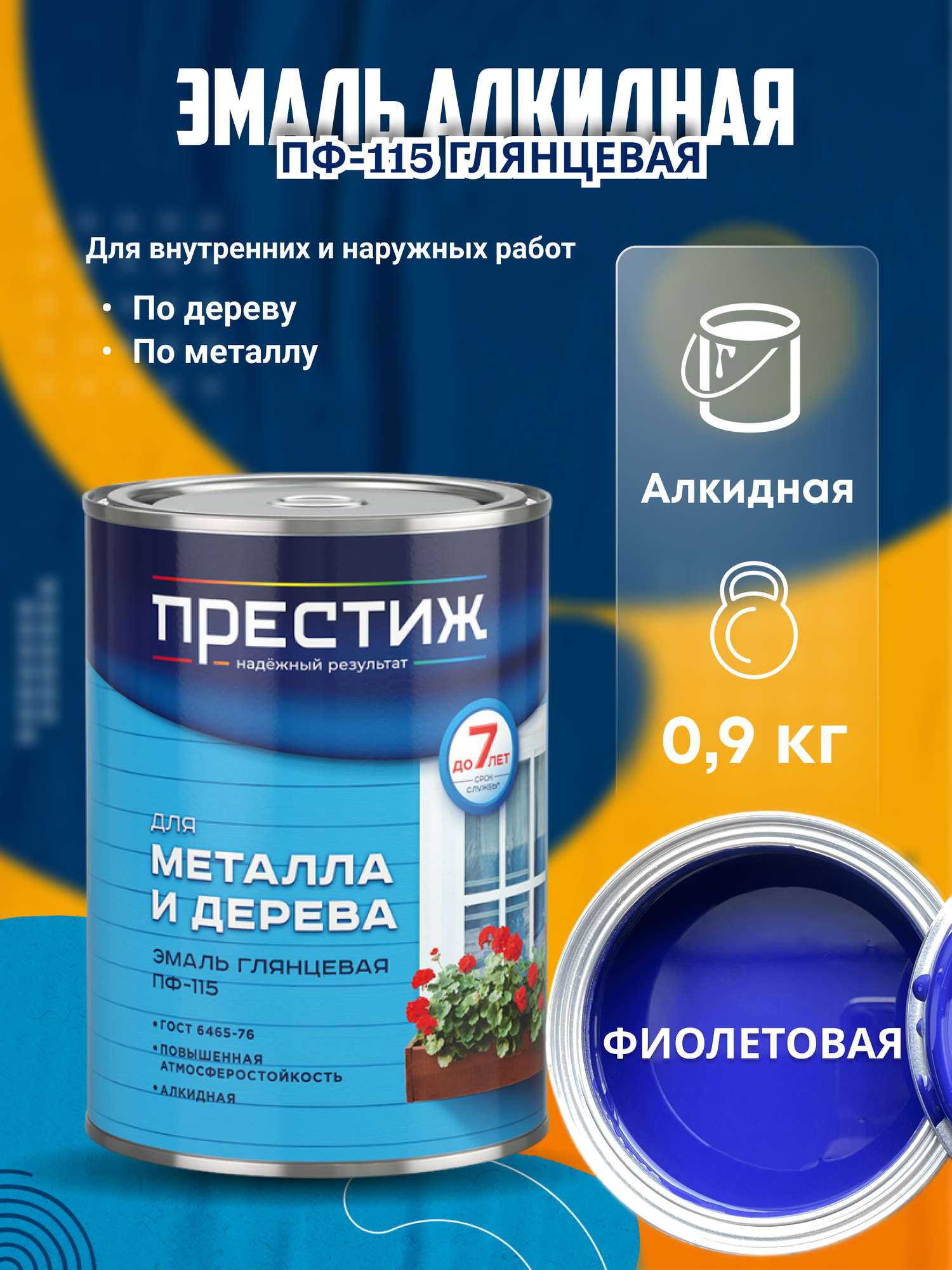 Эмаль ПФ-115 для металла и дерева Престиж, алкидная, глянцевая, 0,9 кг, сиреневая, 1шт, металлическая банка