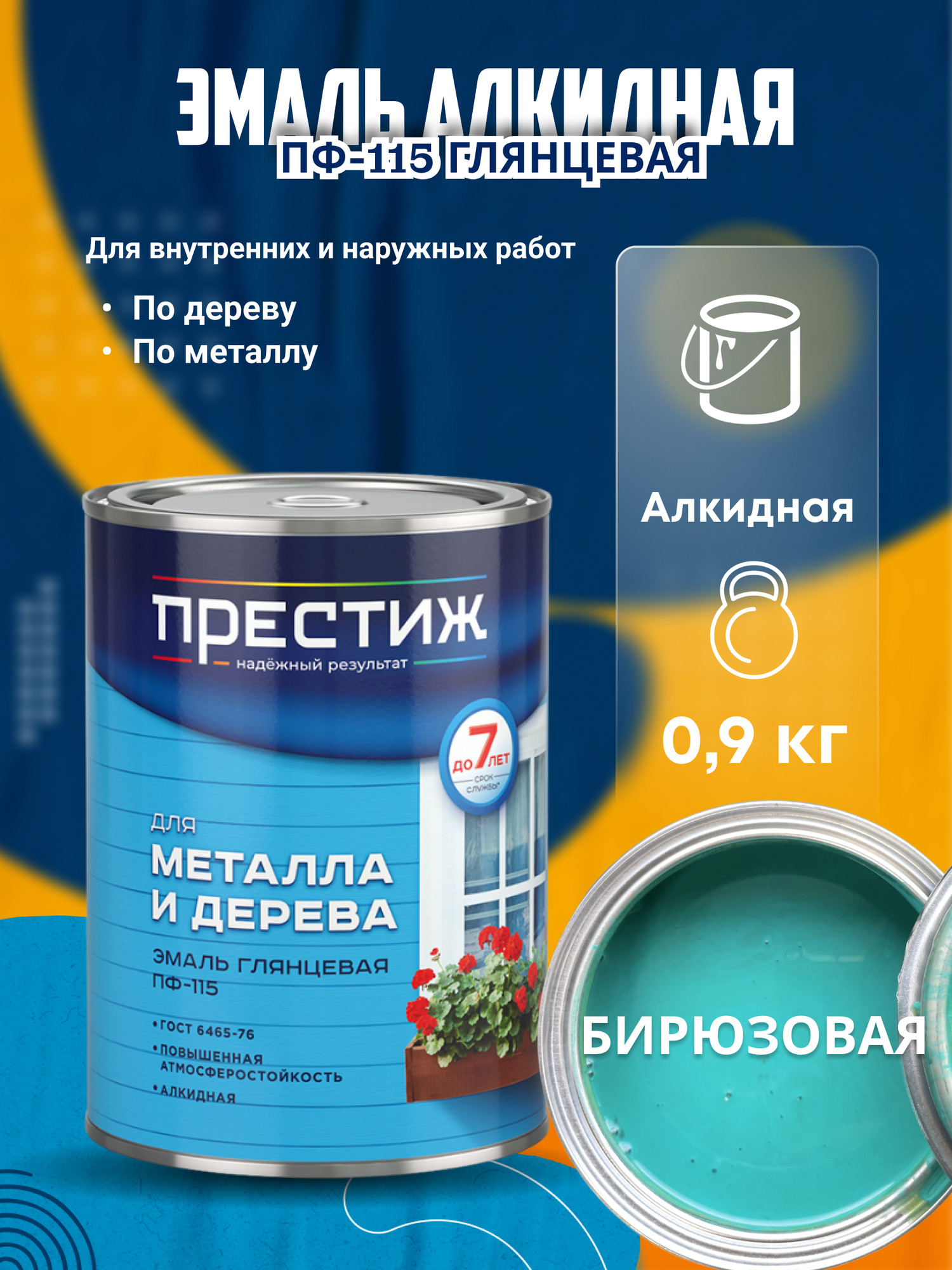 Эмаль ПФ-115 для металла и дерева Престиж, алкидная, глянцевая, 0,9 кг, морская волна, 1шт, металлическая банка