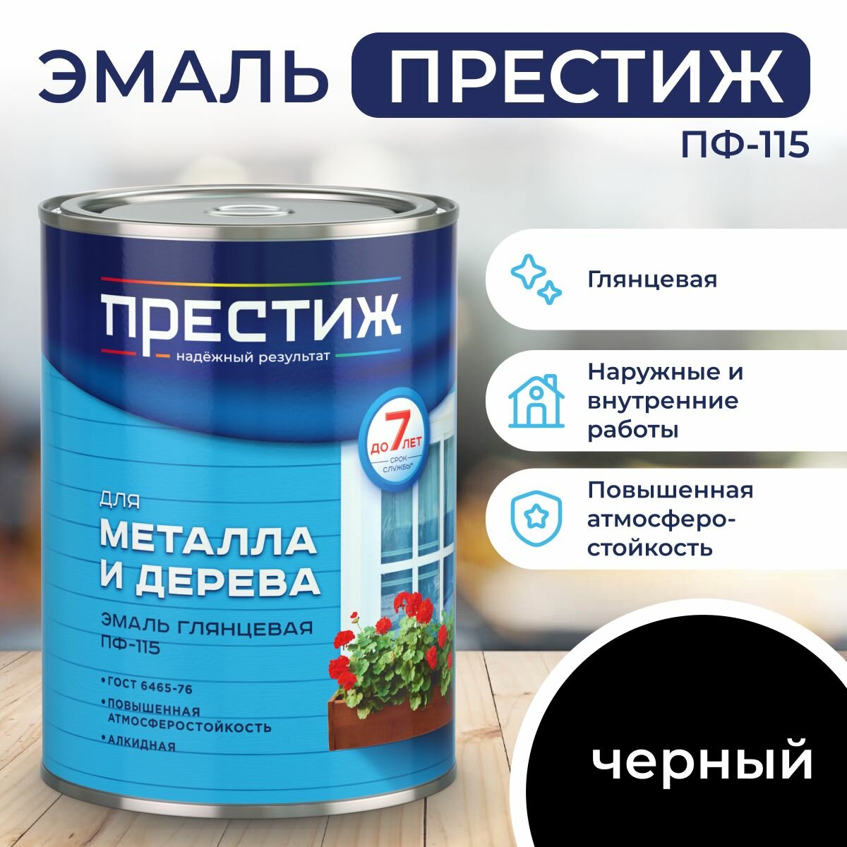 Эмаль ПФ-115 для металла и дерева Престиж, алкидная, глянцевая, 0,9 кг, черная, 1шт, металлическая банка