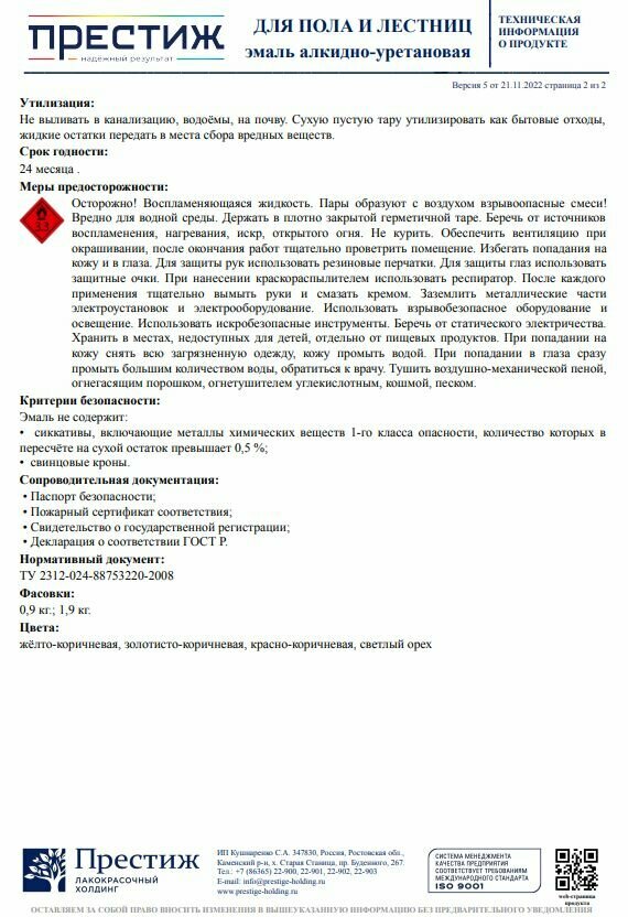 | Дополнительная информация | Эмаль для пола и лестниц Престиж, алкидно-уретановая, глянцевая, 1,9 кг, желто-коричневаяПредназначена для покрытия новых и ранее окрашенных деревянных полов, эксплуатируемых внутри жилых, бытовых и производственных помещений. Подготовка поверхностиНаносить на сухое, чистое и прочное основание. Осыпающиеся и непрочные слои удалить, трещины и углубления выровнять шпатлевкой. Окрашенные и зашпатлеванные поверхности отшлифовать, удалить пыль от шлифовки.ПрименениеГотова к применению. Перед использованием перемешать. При необходимости разбавить уайт-спиритом или сольвентом не более 5%. Наносить 1-2 слоя кистью, валиком, краскораспылителем при температуре от +5 до +35?С и относительной влажности до 80%. Избегать сквозняков и прямых солнечных лучей.РекомендацииДля получения качественного покрытия наносить 2 слоя. При окрашивании больших площадей использовать продукт одной партии и даты изготовления. |