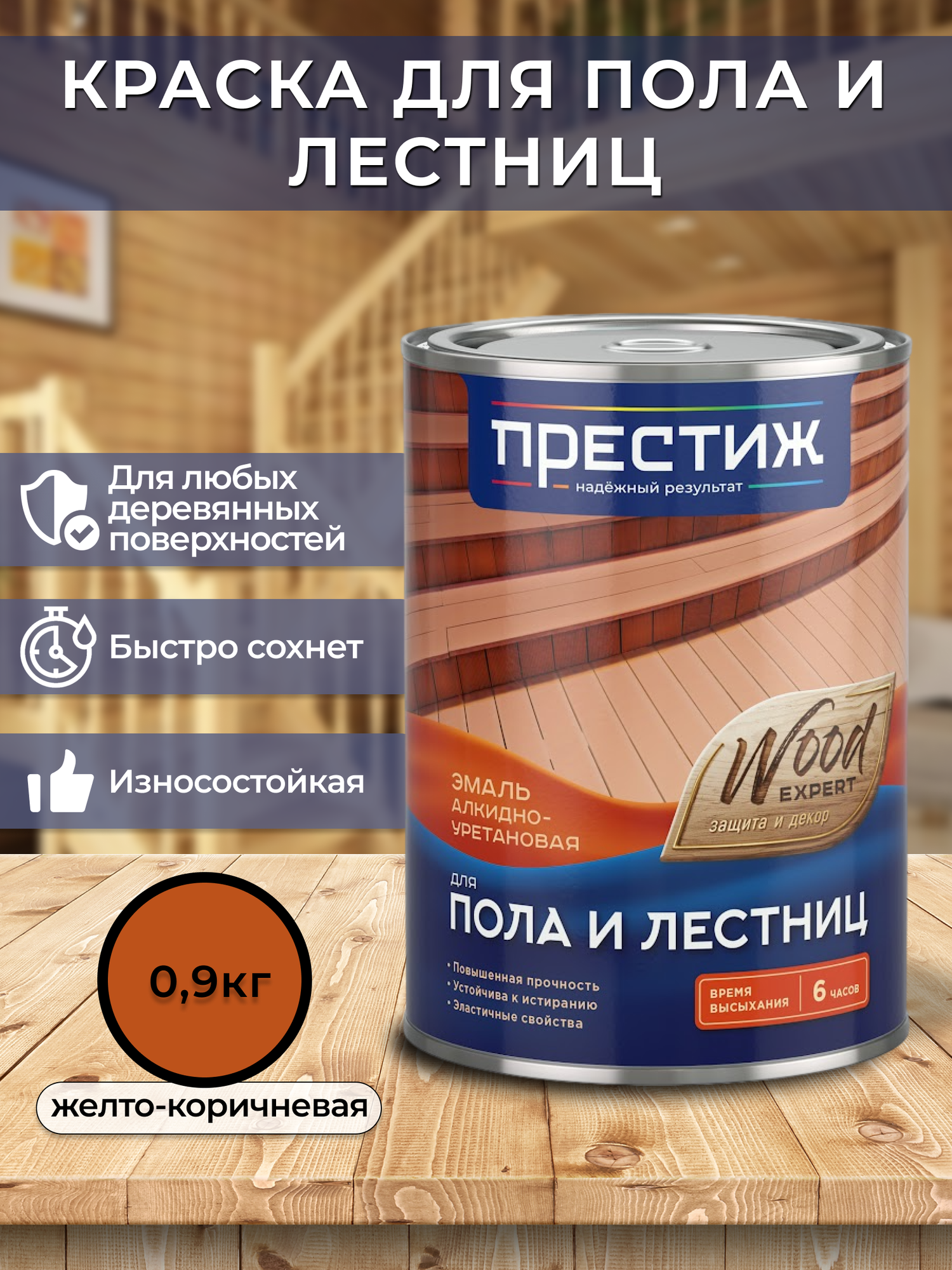 Эмаль для пола и лестниц Престиж, алкидно-уретановая, глянцевая, 0,9 кг, желто-коричневая, 1шт, жестяная банка