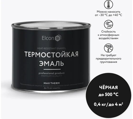 Термостойкая краска Elcon Max Therm для металла, печей, мангалов, радиаторов, дымоходов, суппортов черная до 500 градусов, 0.4 кг