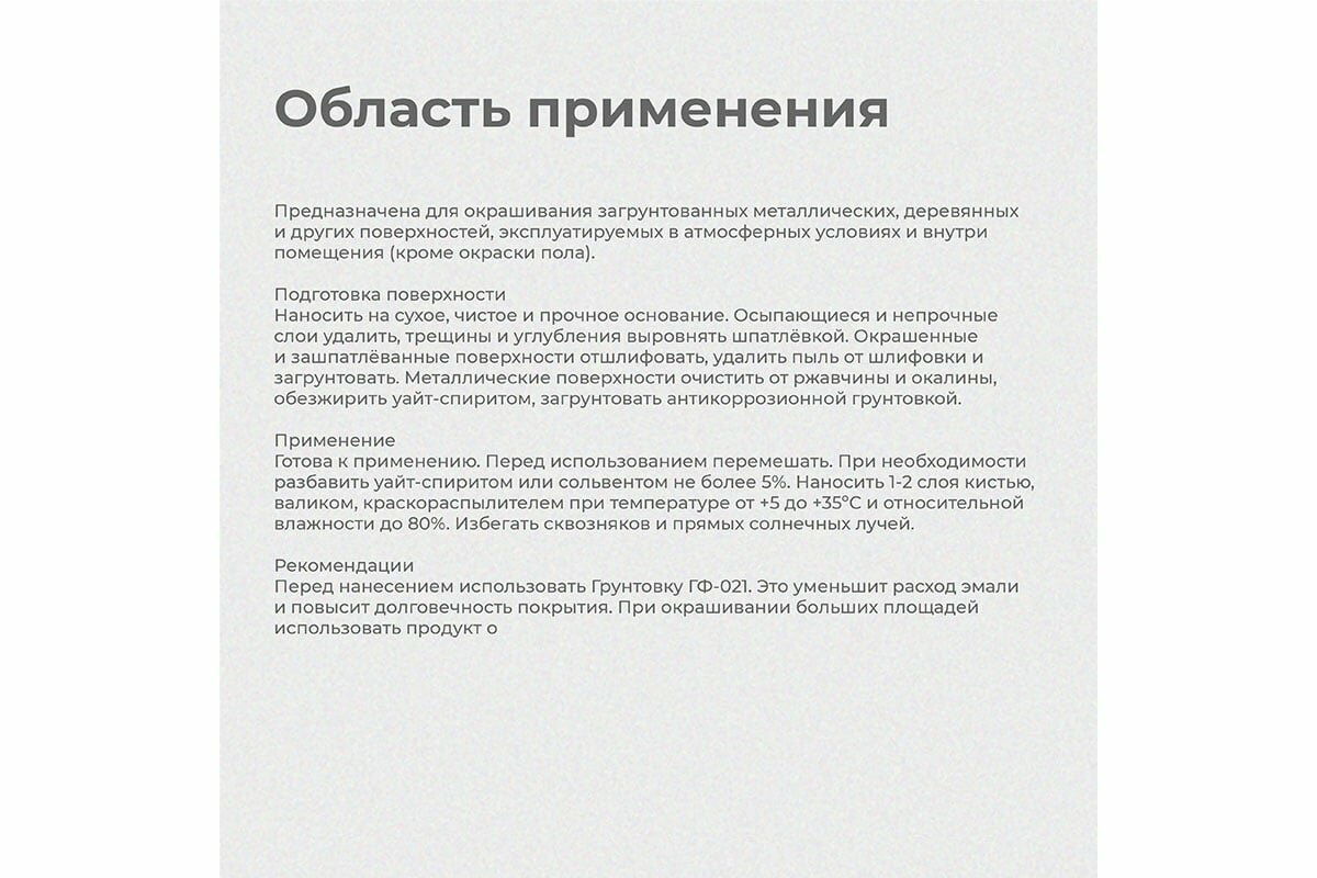 | Область применения | для влажных помещений / для гаражей / для дверей / для душевых поддонов / для дымоходов / для мебели / для металлочерепицы / для наличников / для окон / для перегородок / для печей / для подоконников / для пола / для полок / для потолков / для профнастила / для радиаторов / для разделочных досок / для садовой мебели / для стен / для столешниц / для фасадов / эмаль |