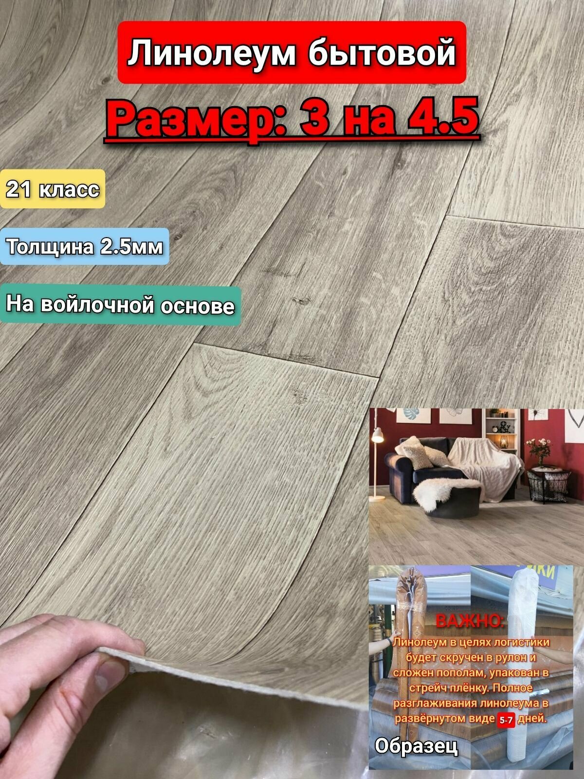 Линолеум бытовой 3.5 на 4.5 АК-3 (21 класс) толщина 2.5 мм, на войлочной основе
