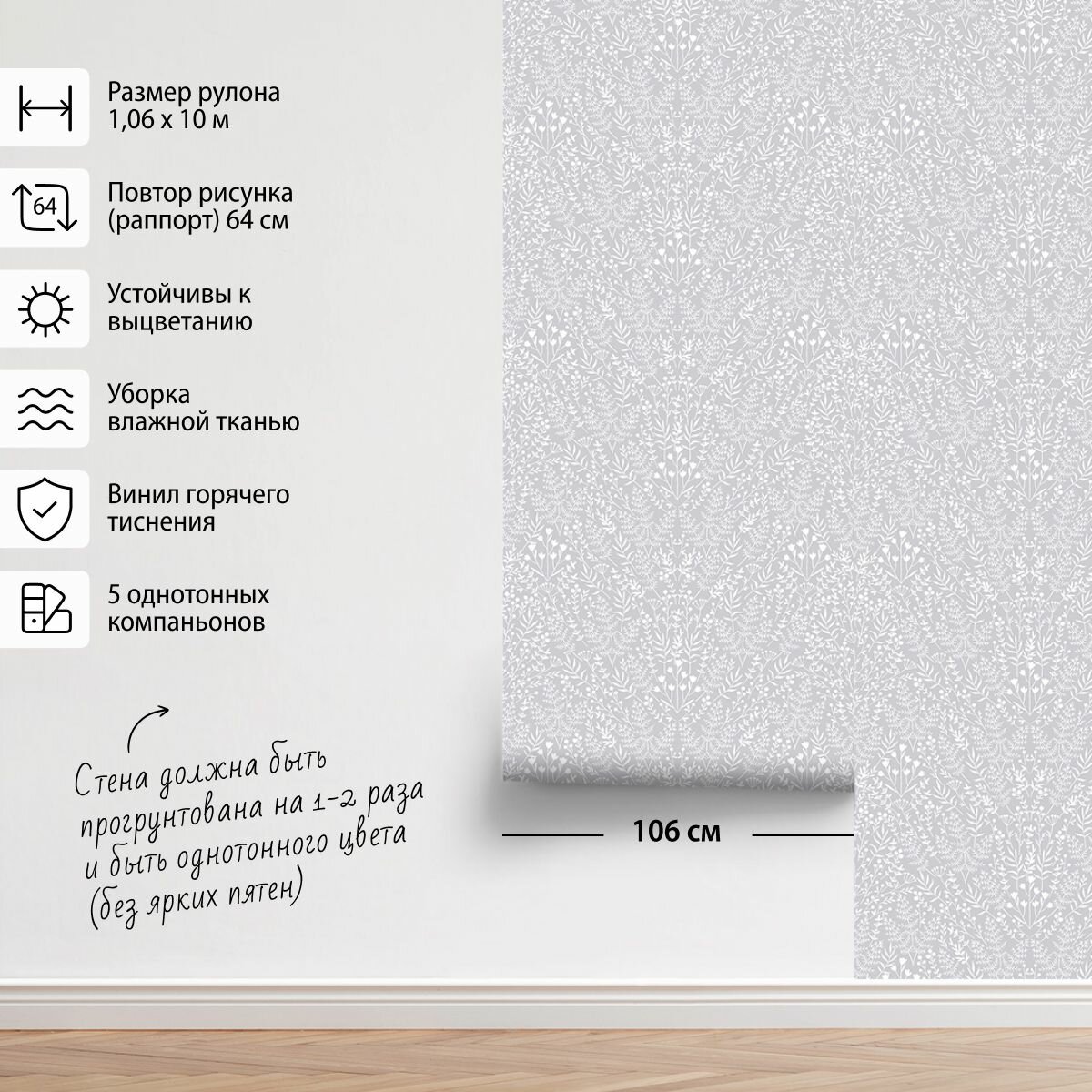 Обои виниловые, папоротники серые, метровые, моющиеся, коридора, Palantine