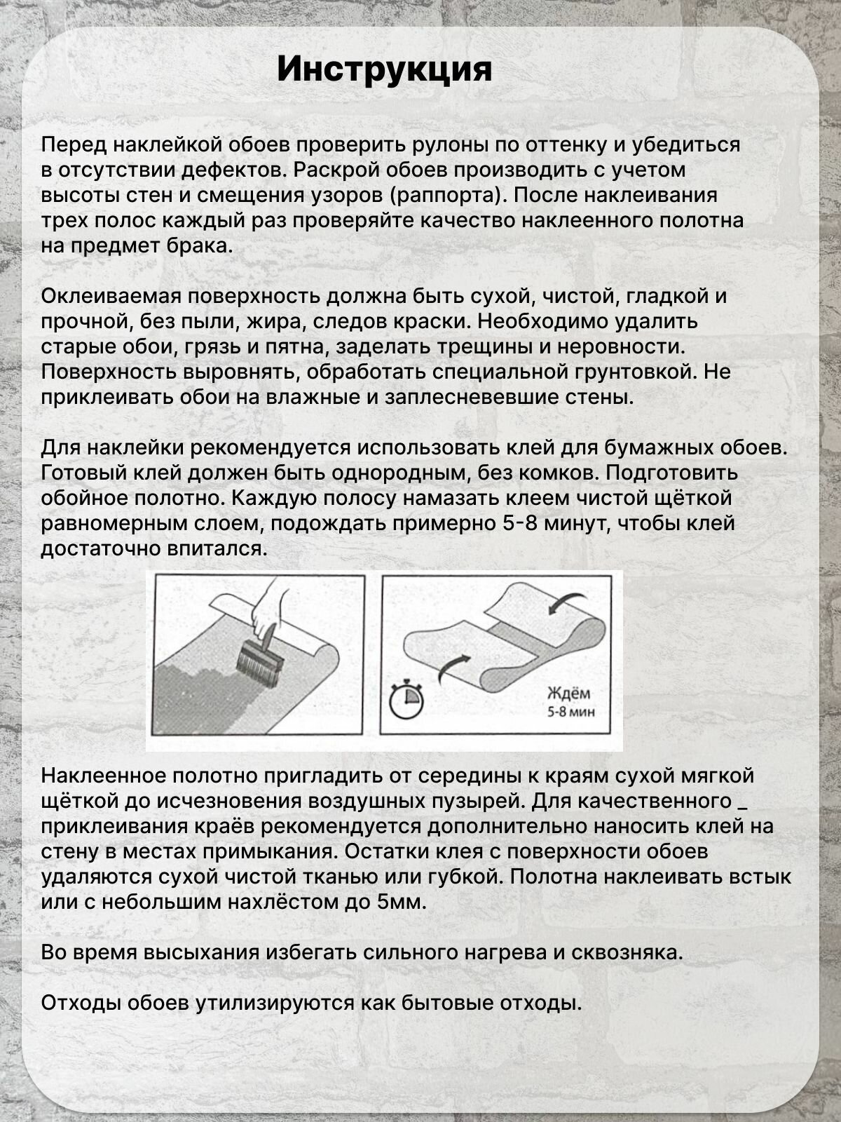 | Комплектация | 1 рулон виниловых обоев с индивидуальной этикеткой (паспорт) под штукатурку, бетон одной партии бумажные, 0.53 м для детской, для девочки, для мальчика, для кухни, гостинной, спальни, зала, коридора упакованный в картонную коробку |