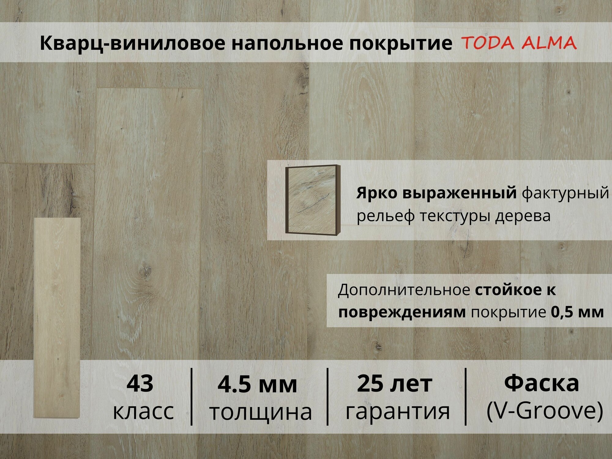 Кварц винил spc 43 класс, Дуб бежевый с серым Кантри Мигрос 4.5 мм TODA ALMA