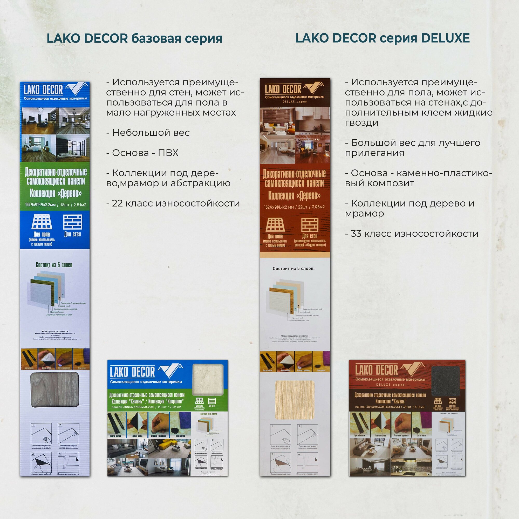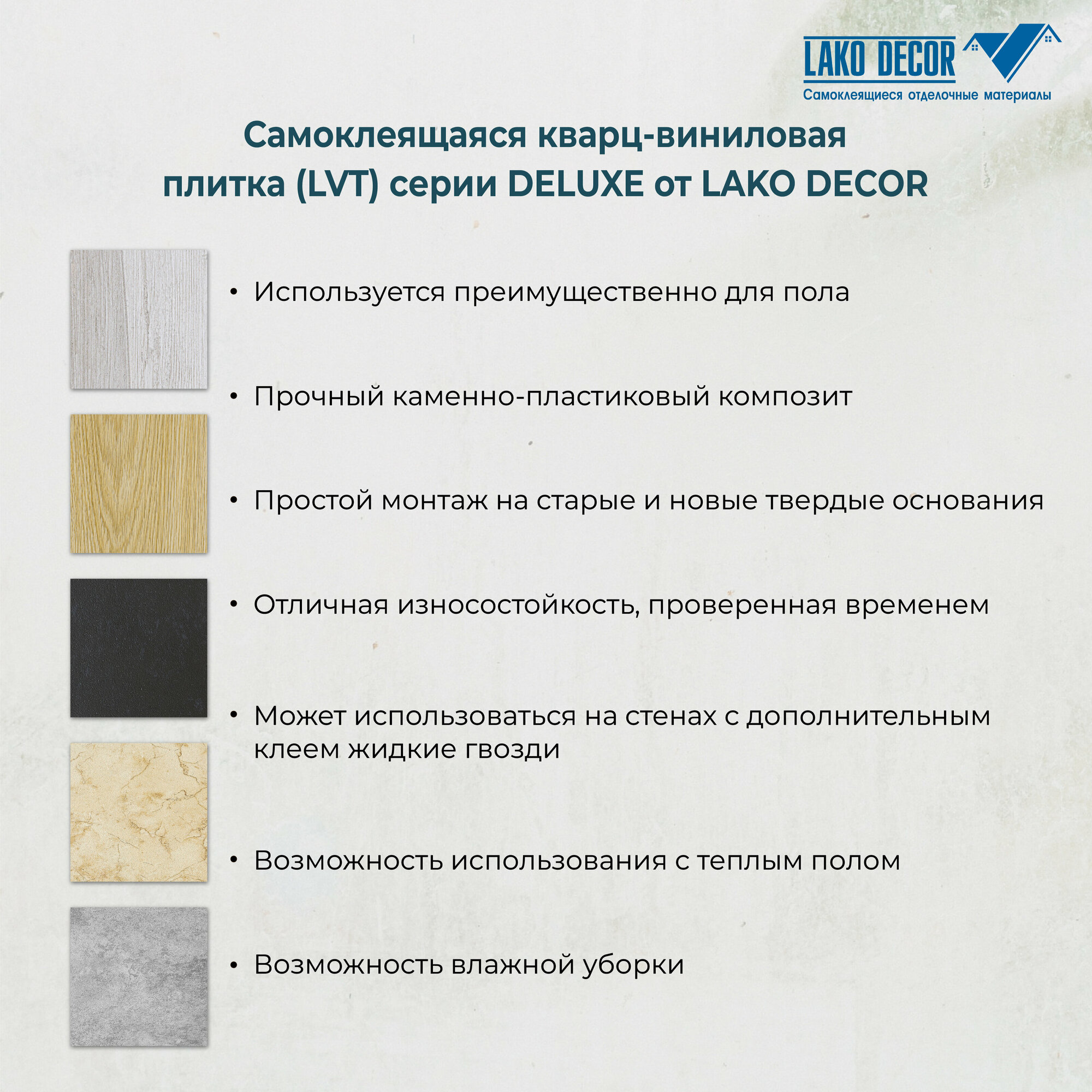 | Дополнительная информация | Самоклеящаяся плитка LVT, при монтаже на стены использовать жидкие гвозди. |