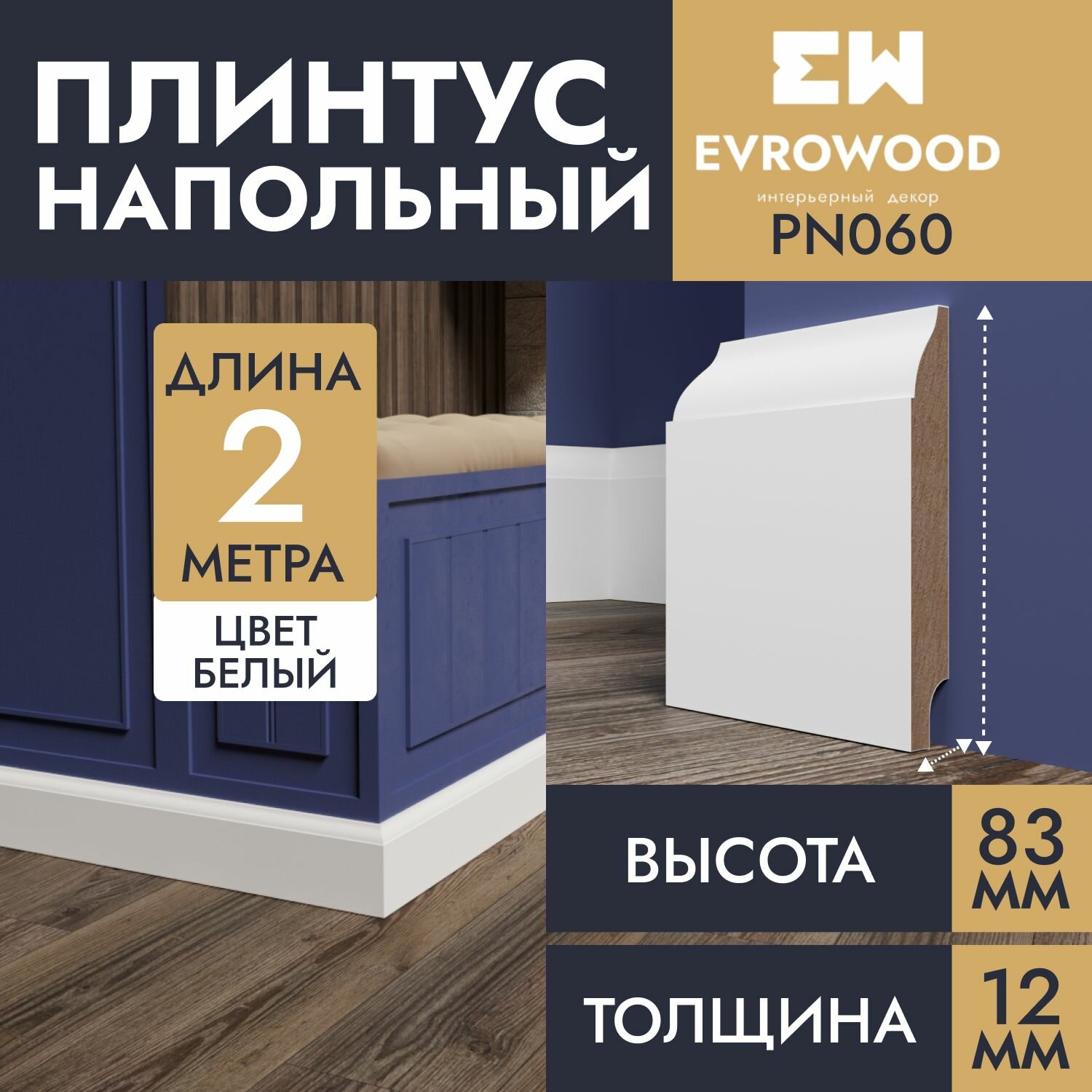 Плинтус напольный МДФ PN060 83х12х2000 EVROWOOD Белый финишный,1ШТ