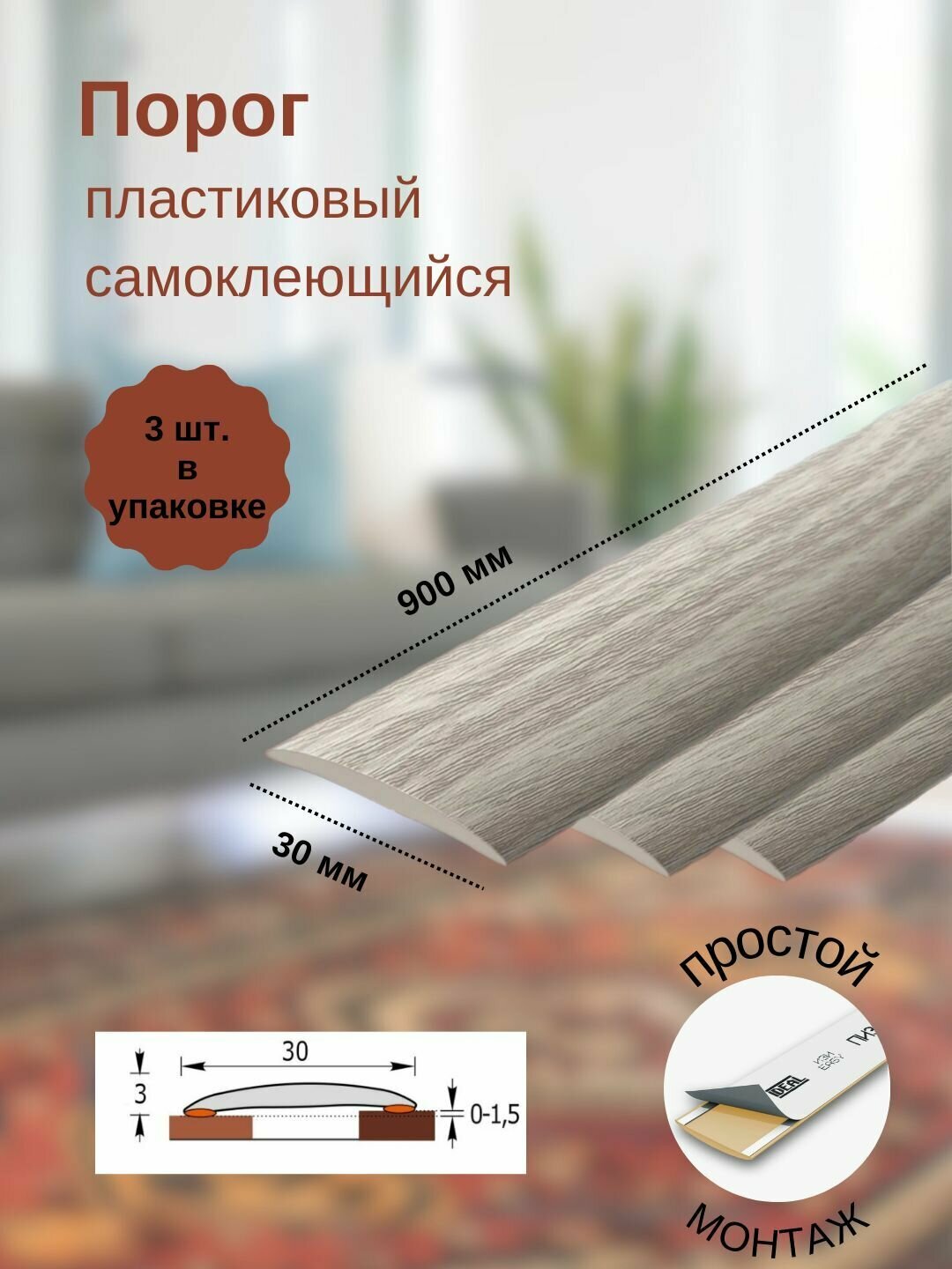 Порог самоклеящийся из пластика 3шт. ИЗИ 30.900.229 для напольных покрытий; Дуб латте 30 х 900 мм