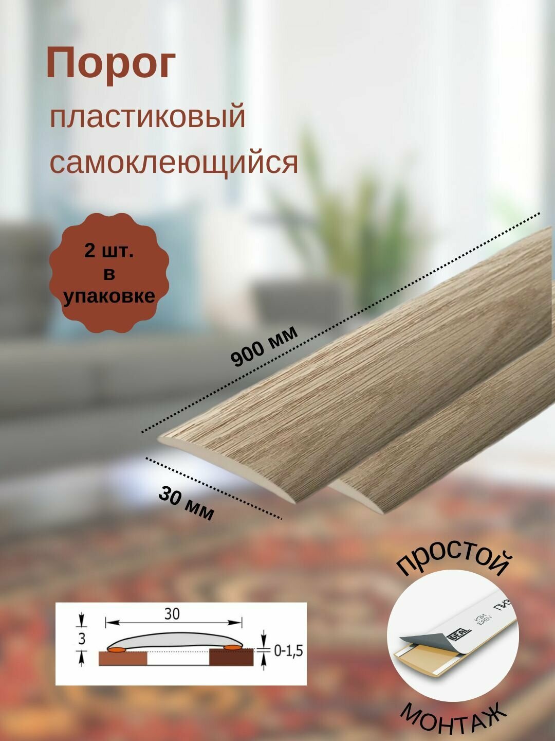 Порог самоклеющийся для пола 30 мм, длина 0,9 м, IDEAL (Идеал) ИЗИ, пластиковый (ПВХ), дуб рустик 211