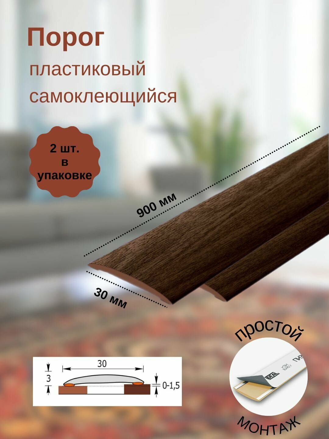 Порог самоклеящийся из пластика 3шт. ИЗИ 30.900.208 для напольных покрытий; Дуб мокко 30 х 900 мм