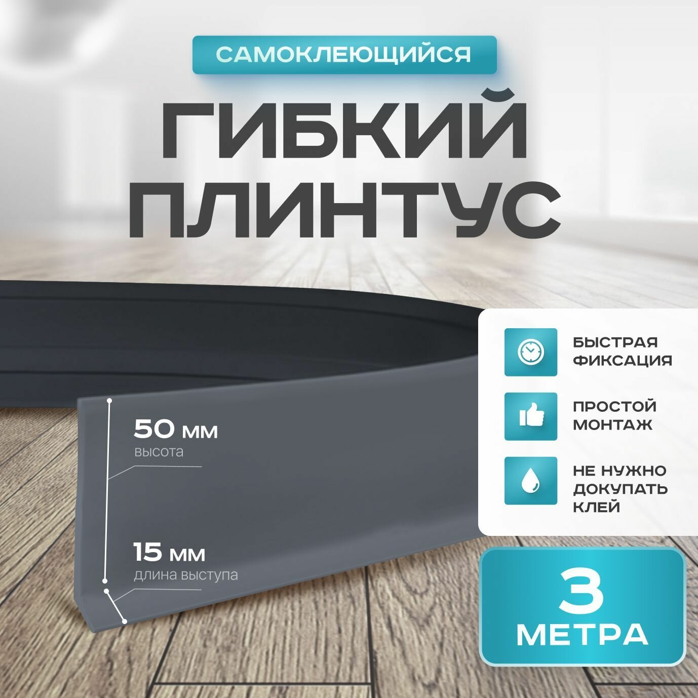 Плинтус гибкий напольный самоклеящийся, 65мм х 3м, графит, гибкий плинтус для пола.
