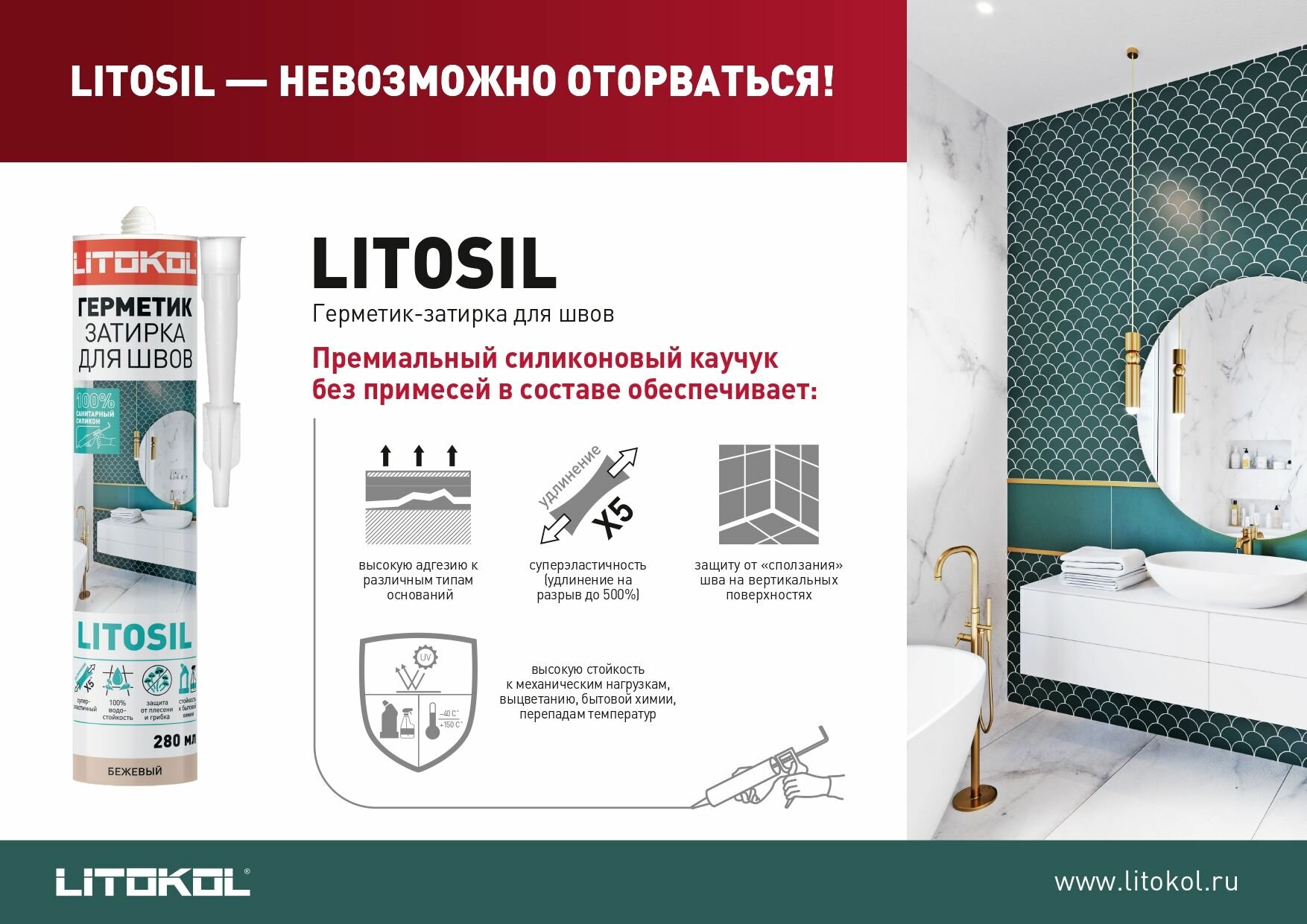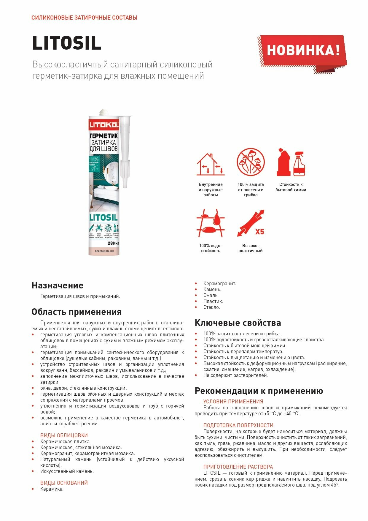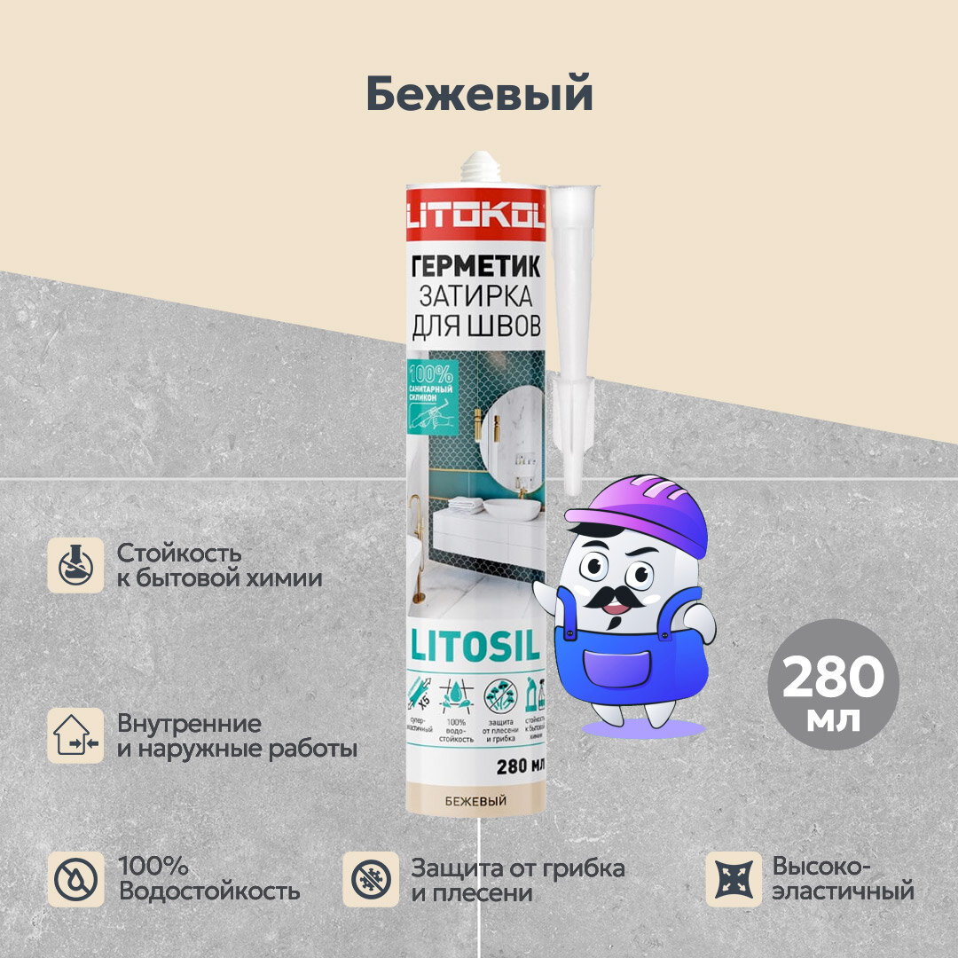 LITOSIL бежевый Высокоэластичный санитарный силиконовый герметик-затирка для влажных помещений 280 м интересное: