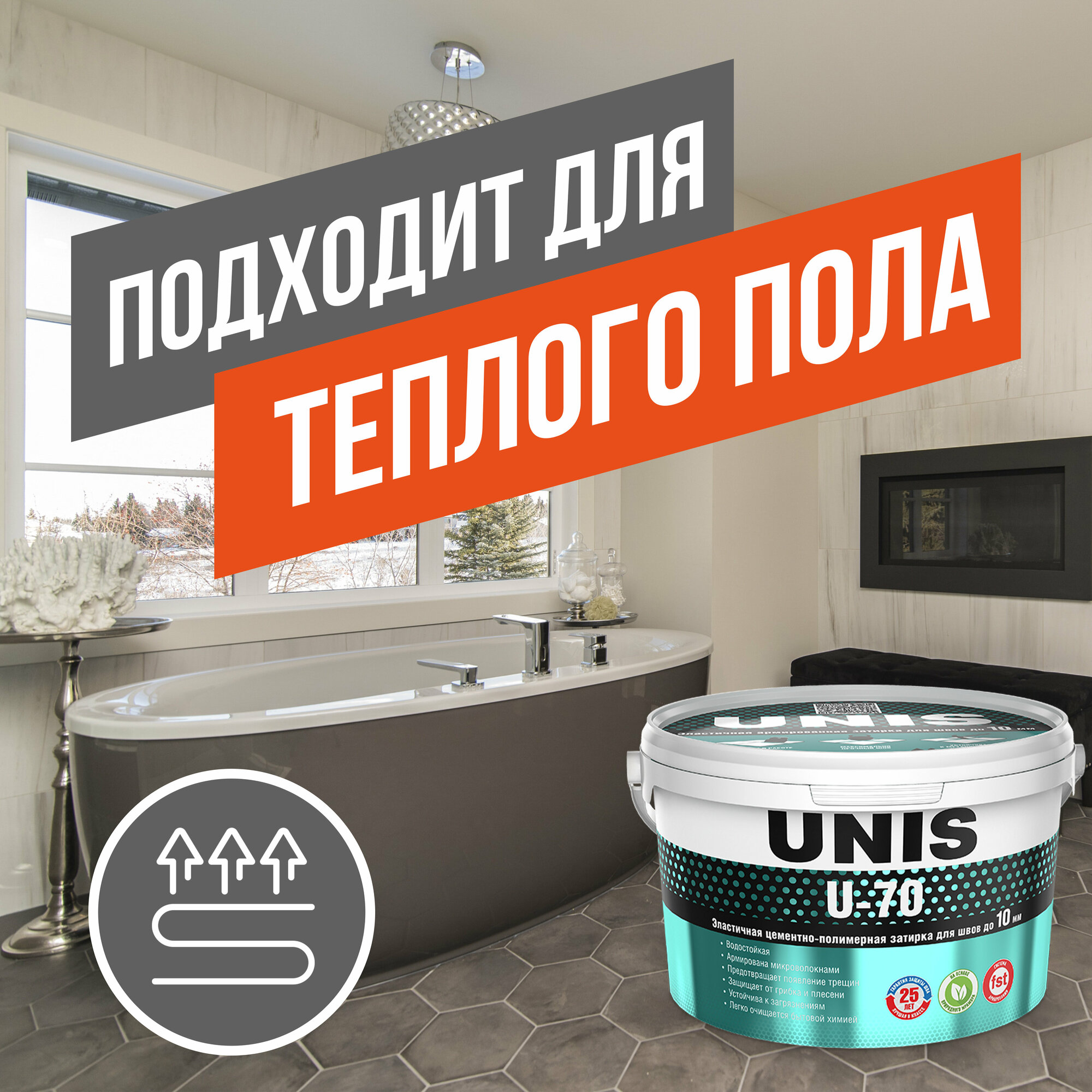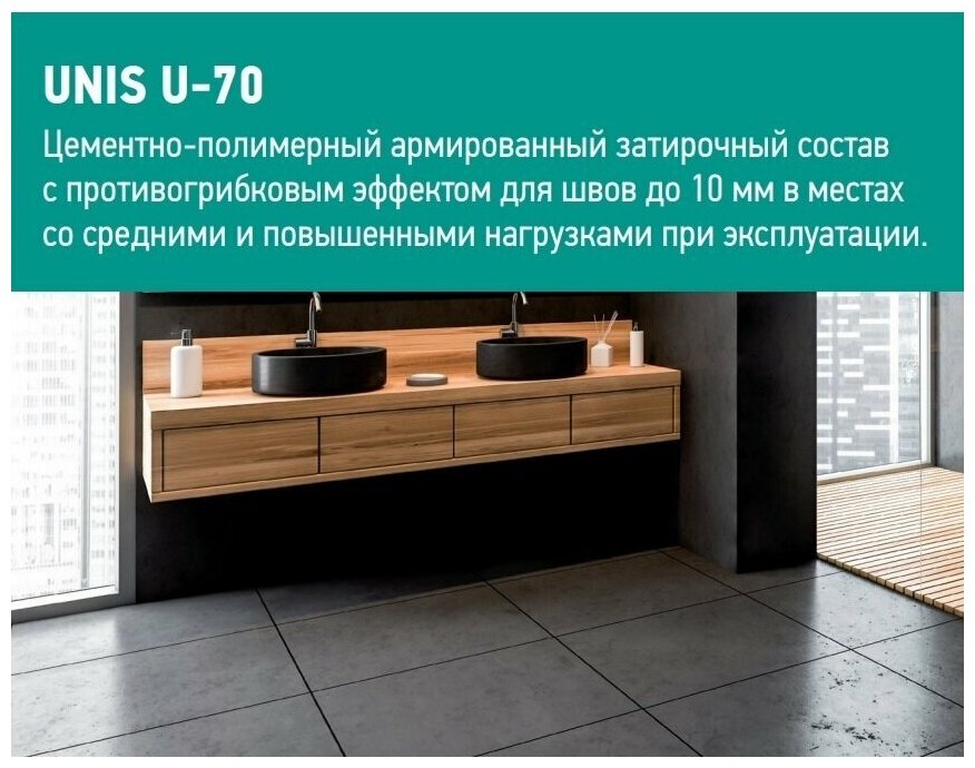 Затирка для плитки эластичная UNIS U-70 2 кг асфальт С13/ Цементная армированная с защитой от грибка и плесени