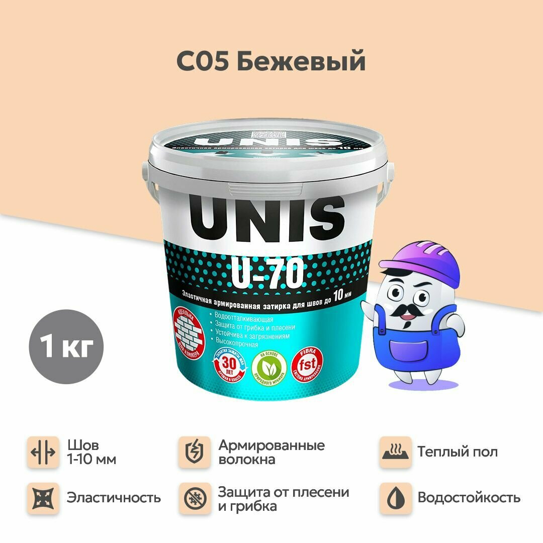 Затирка для плитки эластичная UNIS U-70 2 кг бежевая С05/ Цементная армированная с защитой от грибка и плесени