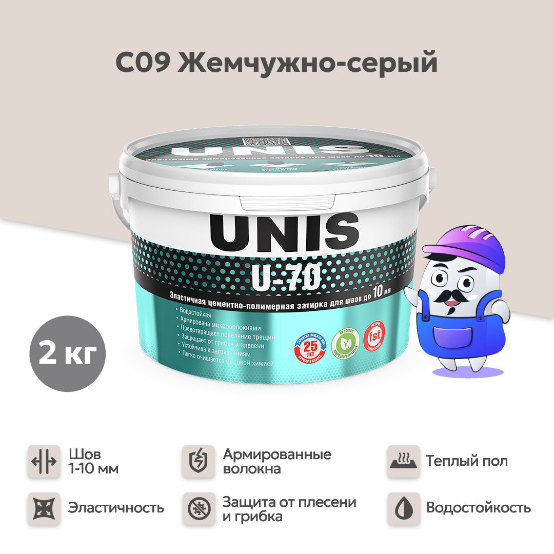 Затирка для плитки эластичная UNIS U-70 2 кг жемчужно-серый С09/ Цементная армированная с защитой от грибка и плесени