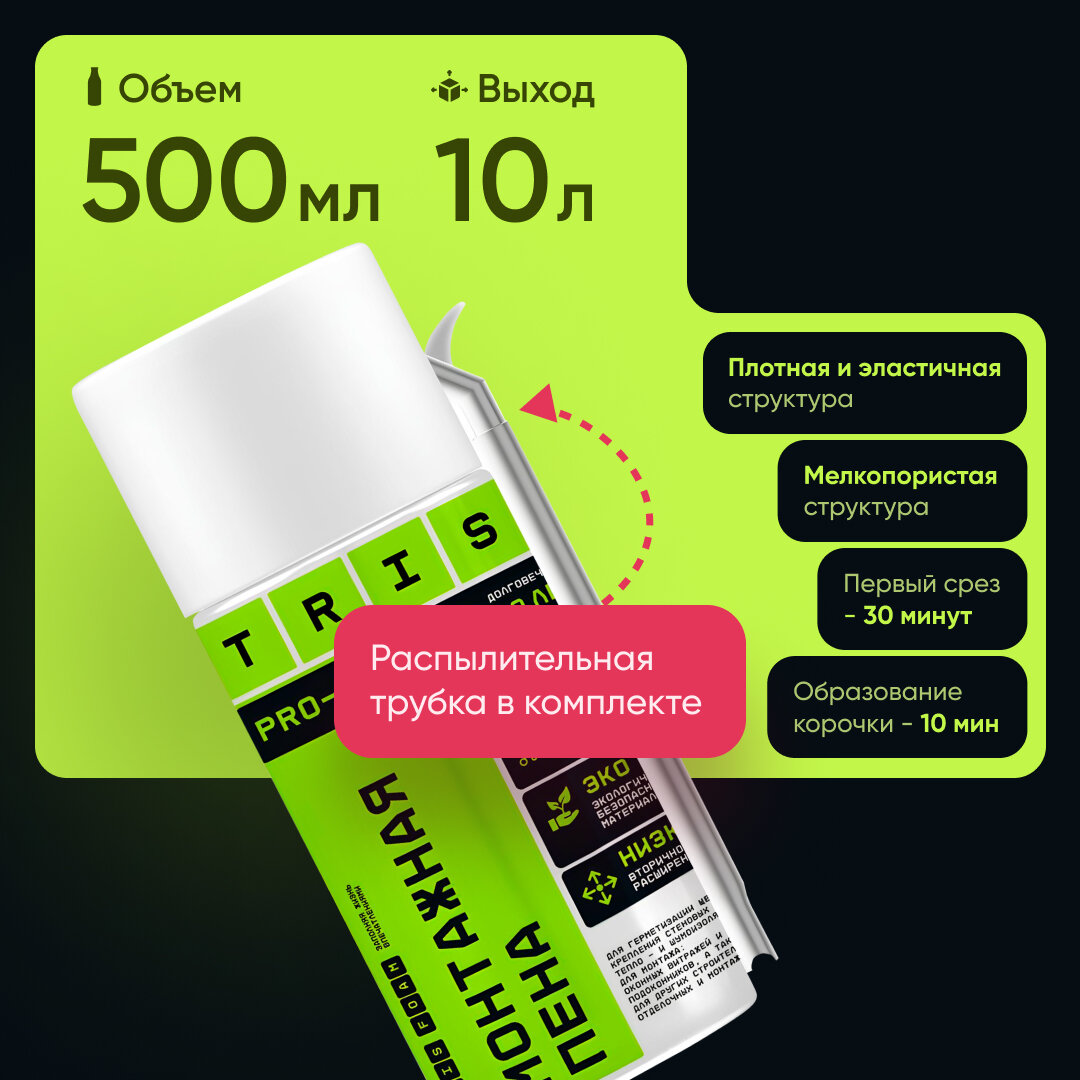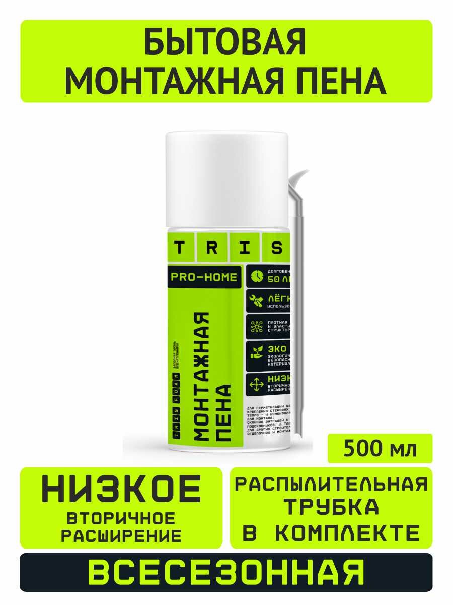 Бытовая монтажная пена PRO-HOME (с бытовой трубкой в комплекте) / для мелко- объёмных монтажей с выходом до 10 литров готового продукта / TRIS 500 мл. интересное: