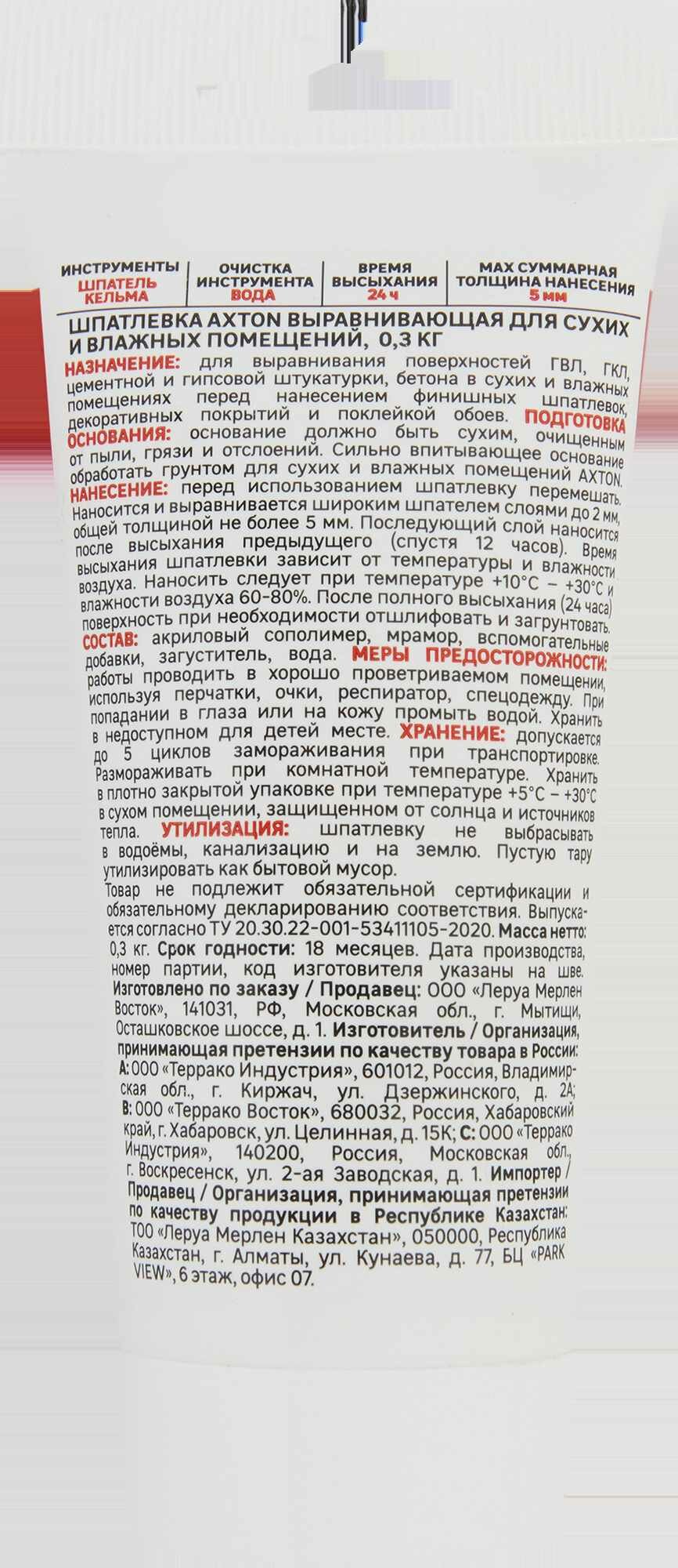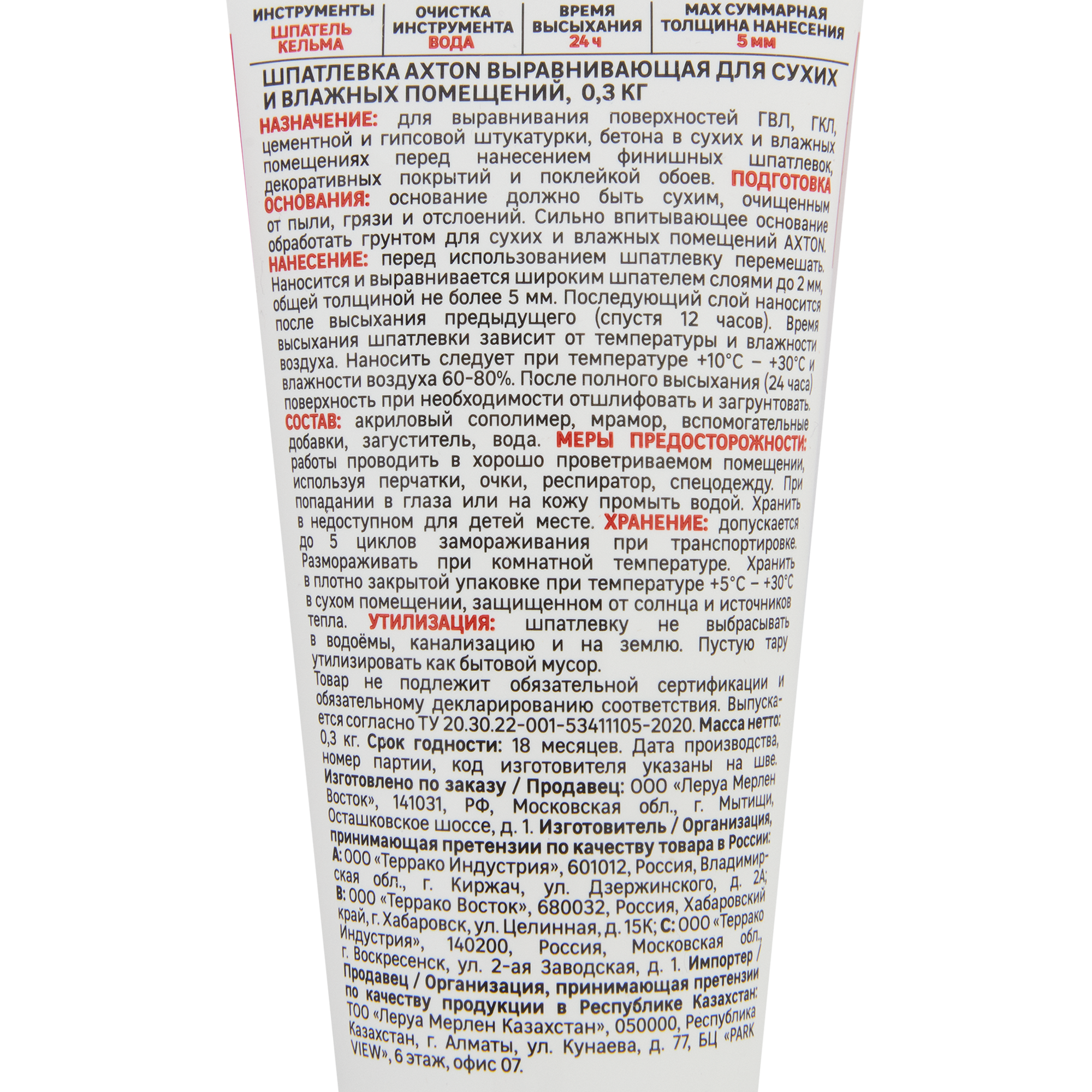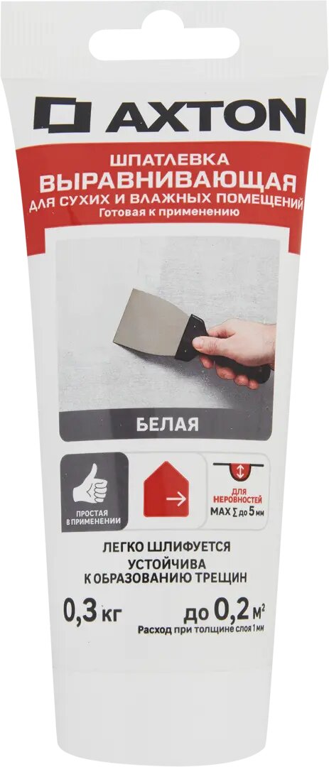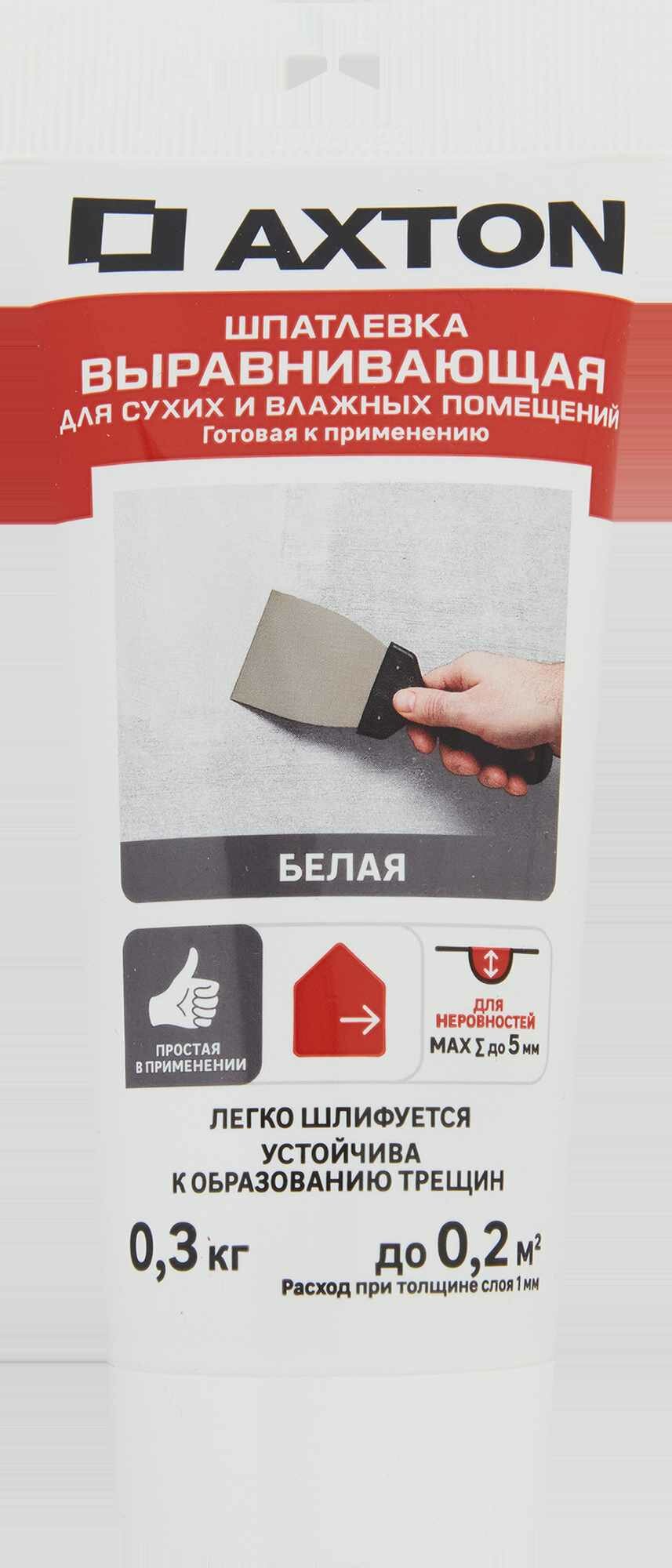 | Дополнительная информация | Шпатлевка Axton выравнивающая для сухих и влажных помещений цвет белый 0.3 кг |