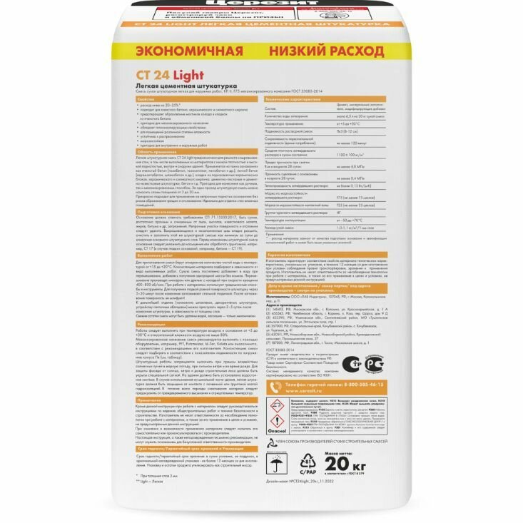 CERESIT CT 24 LIGHT штукатурка для оснований из пено и газобетона, внутри и снаружи помещений (20кг) интересное: