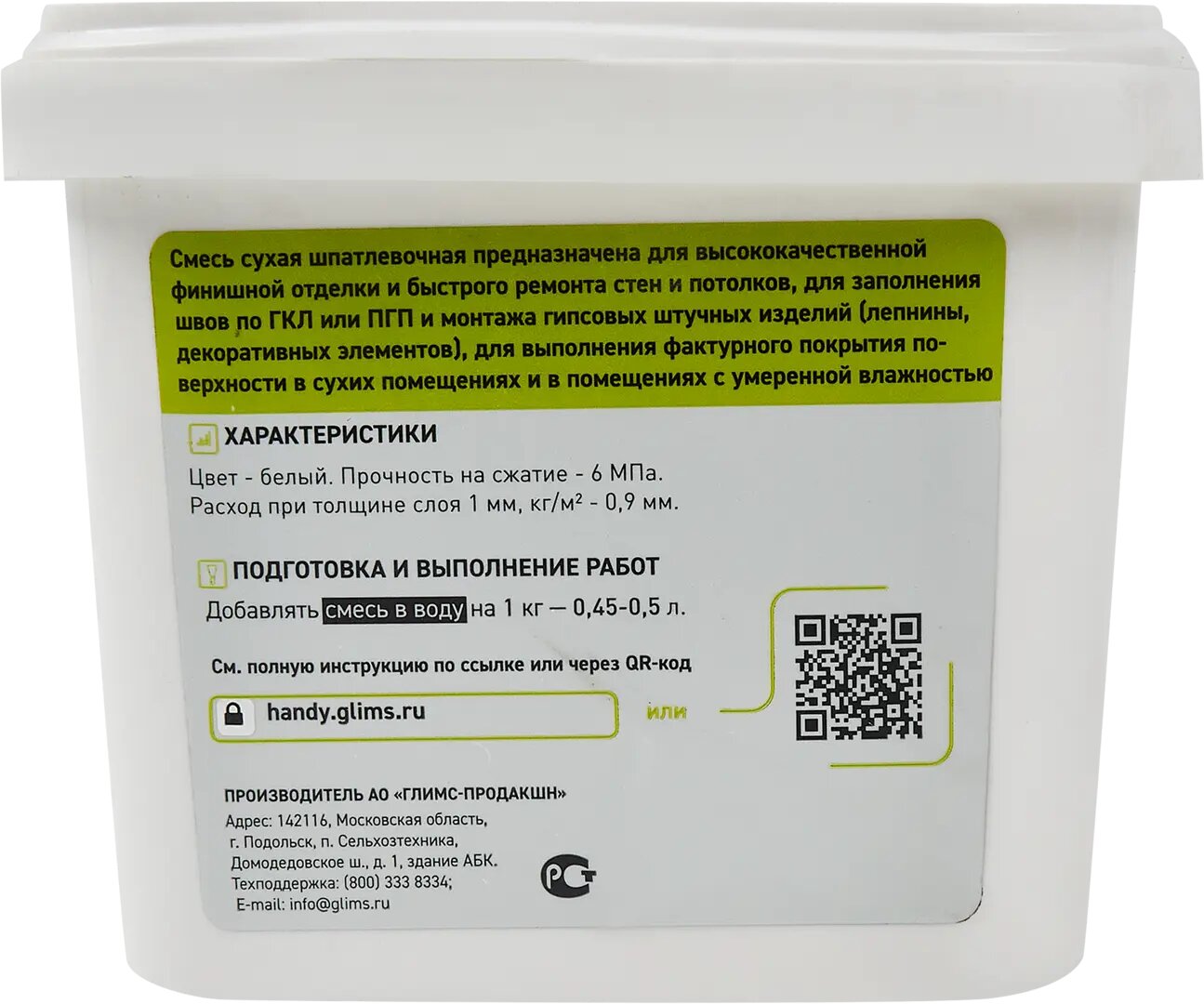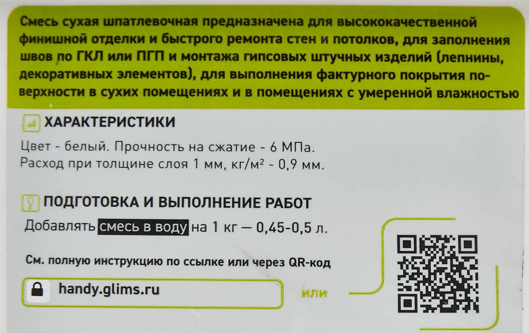 | Дополнительная информация | Ремонтная смесь гипсовая быстрая Glims Handygyps 0.8 кг |