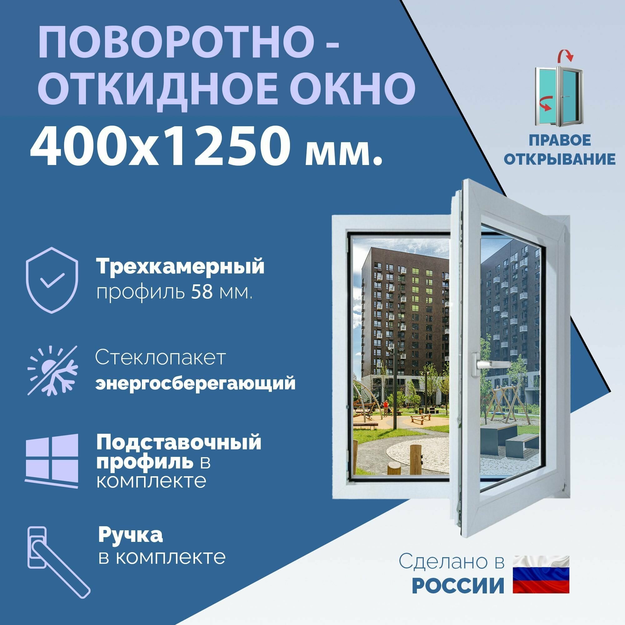 СохранитьПоворотно-откидное ПВХ окно правое (ШхВ) 400х1250 мм. (40х125см.) Экологичный профиль KRAUSS - 58 мм. Энергосберегающий стеклопакет в 2 стекла - 24 мм. интересное:
