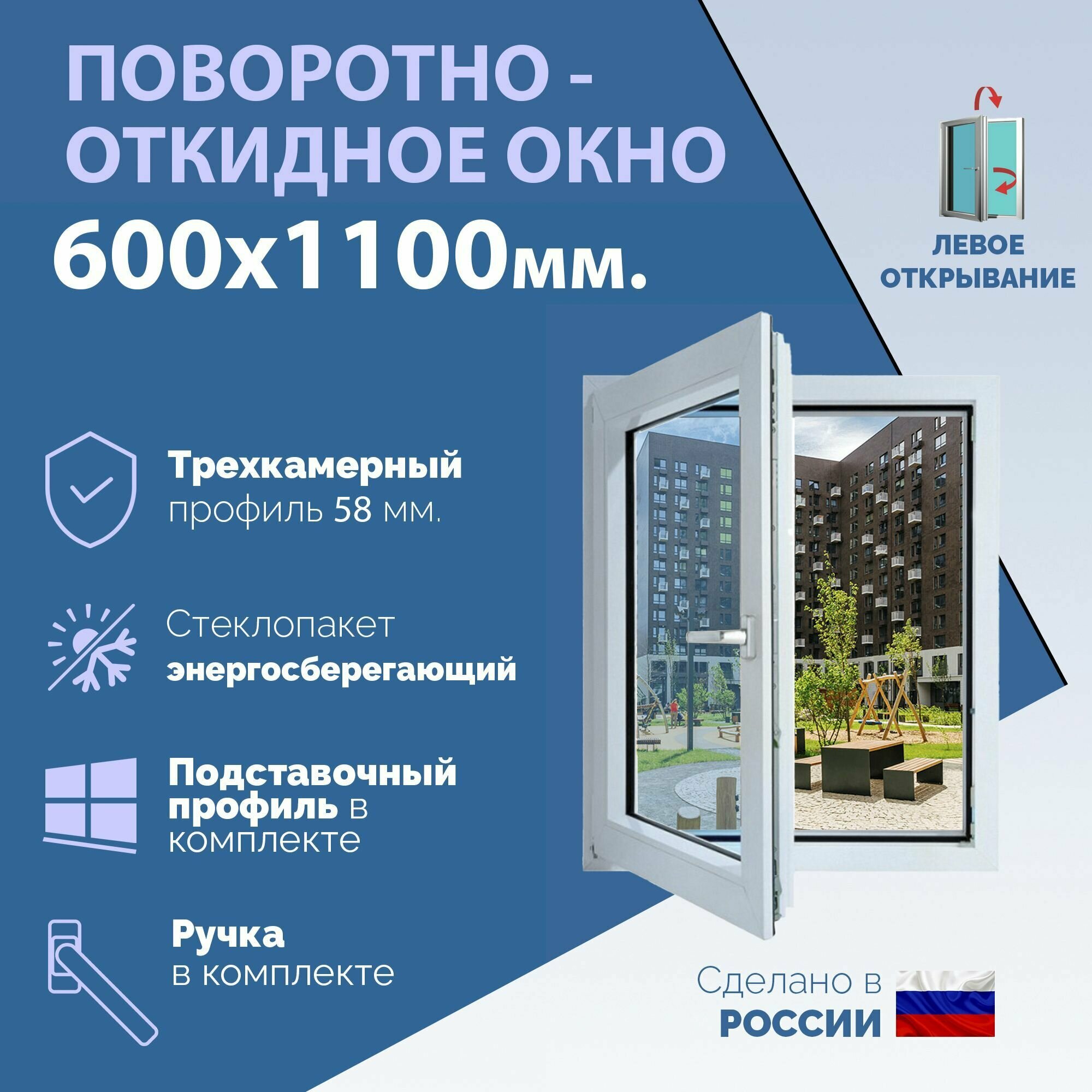 Купить Поворотно-откидное ПВХ окно левое (ШхВ) 600х1100 мм. (60х110см.) Экологичный профиль KRAUSS - 58 мм. Энергосберегающий стеклопакет в 2 стекла - 24 мм.