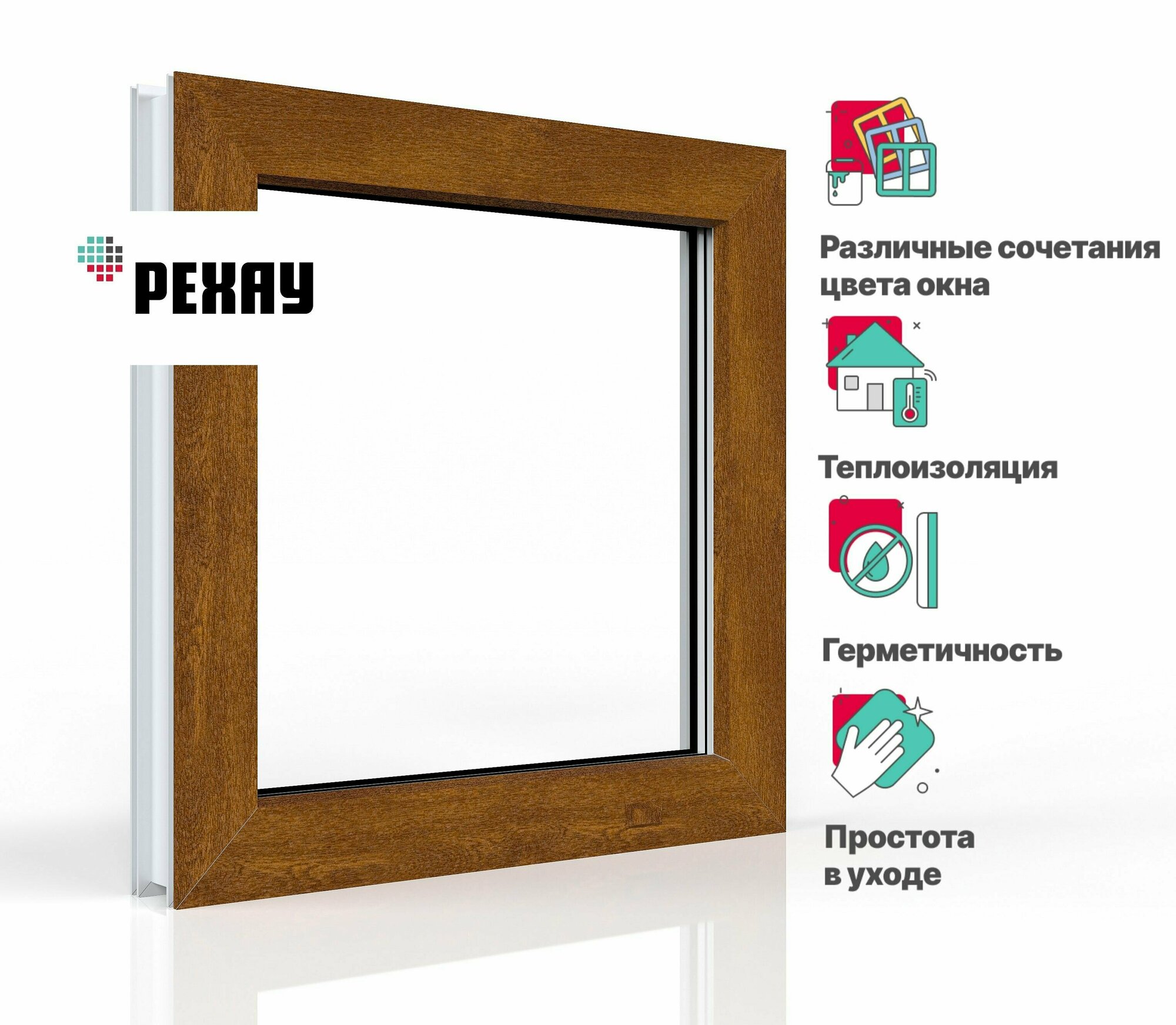 Пластиковое окно РЕХАУ BLITZ глухое, 600х600 мм (ВхШ) с учетом подставочного профиля, двухкамерное внешний цвет золотой дуб