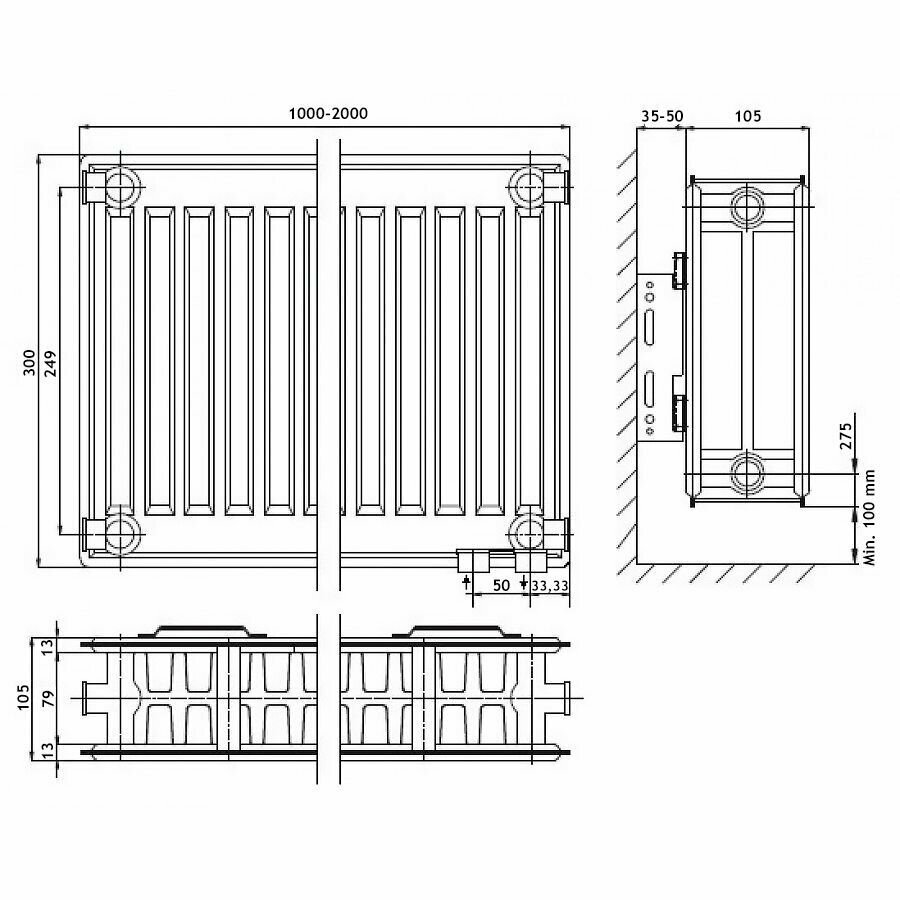 | Подробная комплектация | Радиатор в упаковке – 1 шт. Настенный кронштейн для крепления – 2 шт (для длины 400-1500), 3 шт (для длины 1600-3000) Воздухоотводчик – 1 шт. Заглушка – 1шт. Шуруп с дюбелем – 4 шт (для длины 400-1500), 6 шт (для длины 1600-3000) Пластиковый дюбель – 4 шт (для длины 400-1500), 6 шт (для длины 1600-3000) |