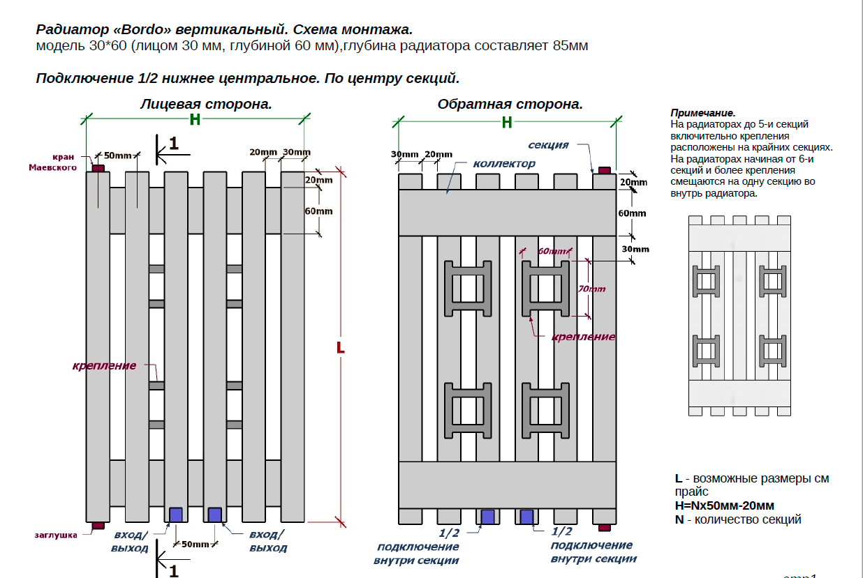 | Подробная комплектация | Радиатор, 2 крана Маевского, 4 кронштейна крепления, транспортировочные заглушки, паспорт изделия, гарантийный талон. |