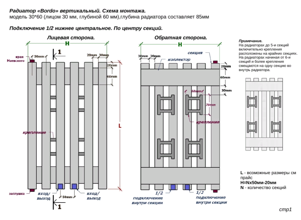 | Подробная комплектация | Радиатор, 2 крана Маевского, 4 кронштейна крепления, транспортировочные заглушки, паспорт изделия, гарантийный талон. |