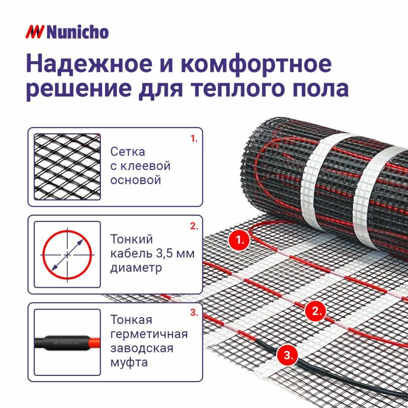 Электрический теплый пол под плитку NUNICHO 1 м2, 150 Вт/м2 двужильный экранированный нагревательный мат;