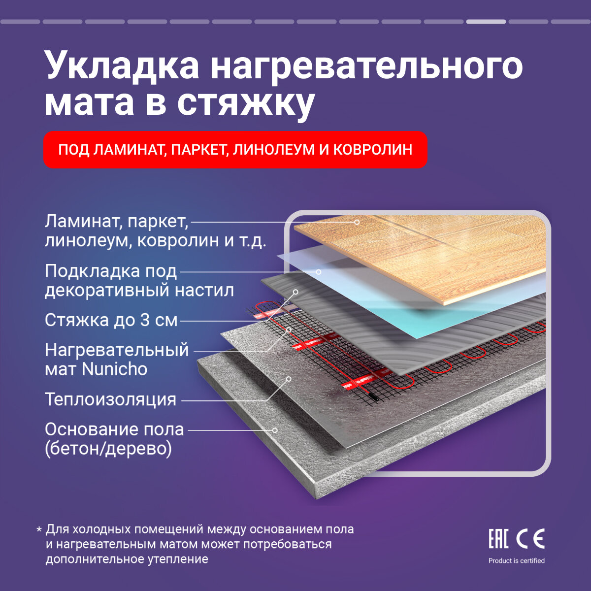Электрический теплый пол под плитку NUNICHO 1 м2, 150 Вт/м2 двужильный экранированный нагревательный мат;