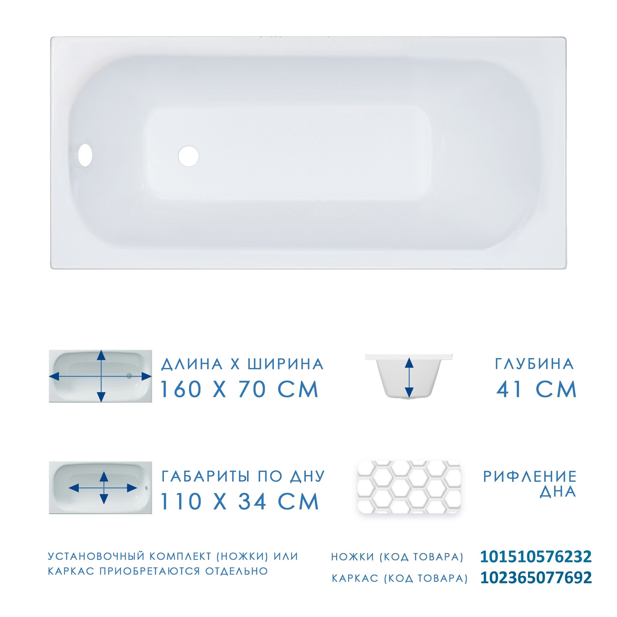 | Подробная комплектация | Стандартная комплектация: - Ванна. Дополнительная комплектация (приобретается отдельно): - Установочный комплект (ножки) - (код товара 101510576232). - Каркас - (код товара: 102365077692); - Декоративная фронтальная панель - (код товара 102360216796). |