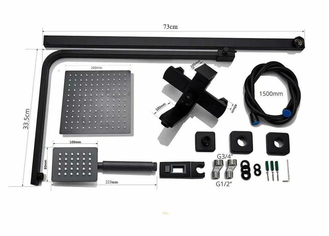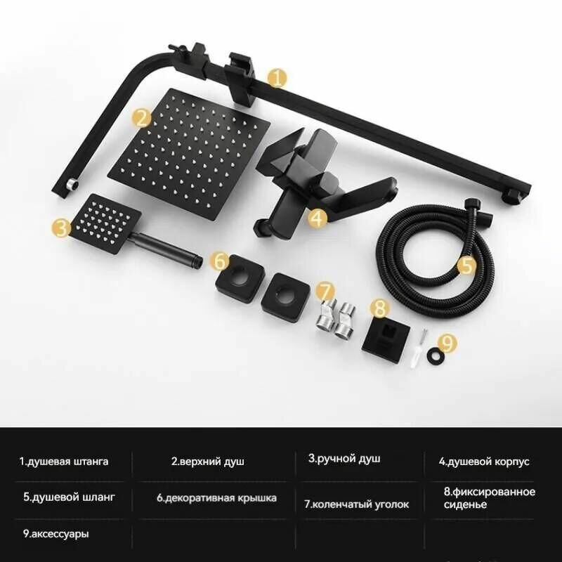 | Комплектация | верхний душ / держатель лейки / душевая стойка / душевая штанга / кронштейн / лейка / ручной душ / Смеситель / шланг |