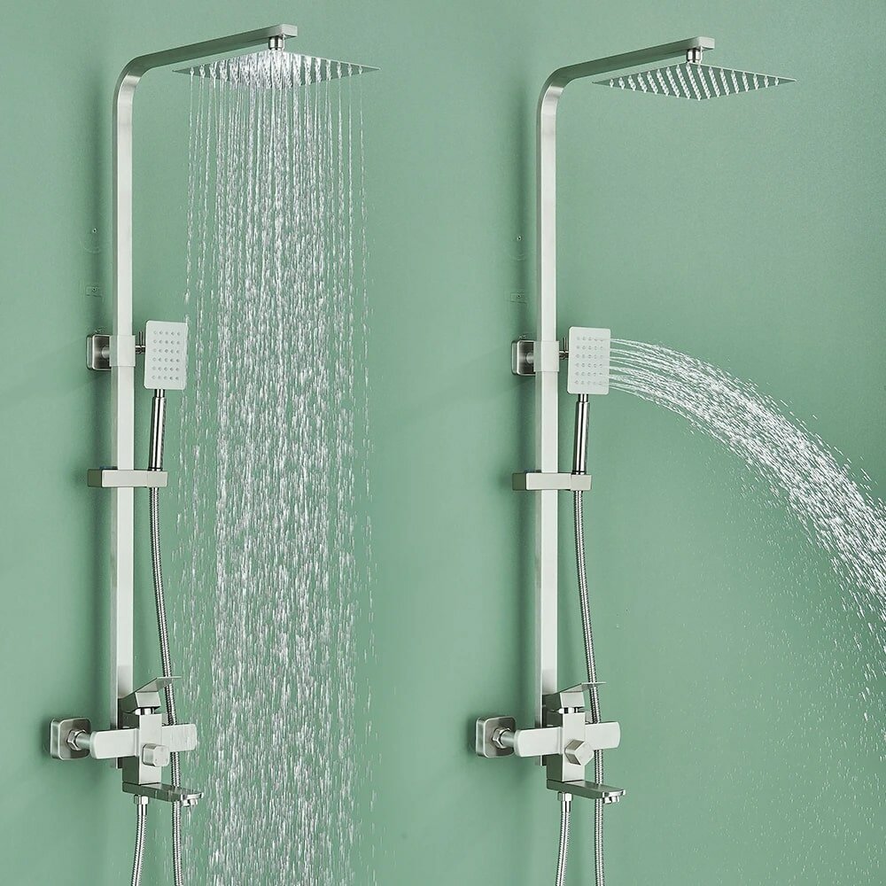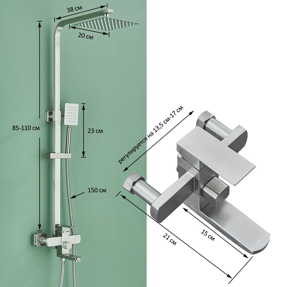 | Комплектация | смеситель с изливом 1шт / душевая стойка 1шт. / верхний душ 1шт. / кронштейн для верхнего душа 1шт. / держатель лейки 1шт. / душевая лейка 1шт. / душевой шланг 1шт. / крепления. |