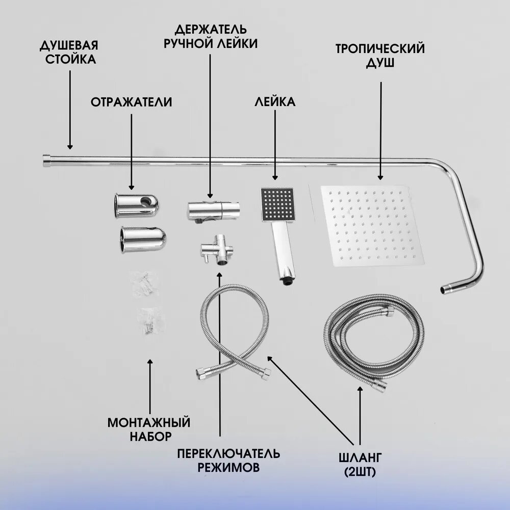 | Комплектация | верхний душ / держатель лейки / душевая стойка / лейка / ручной душ / Смеситель |