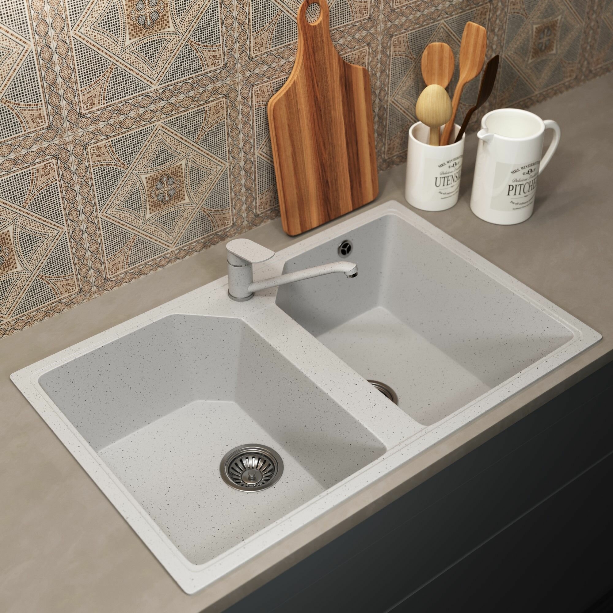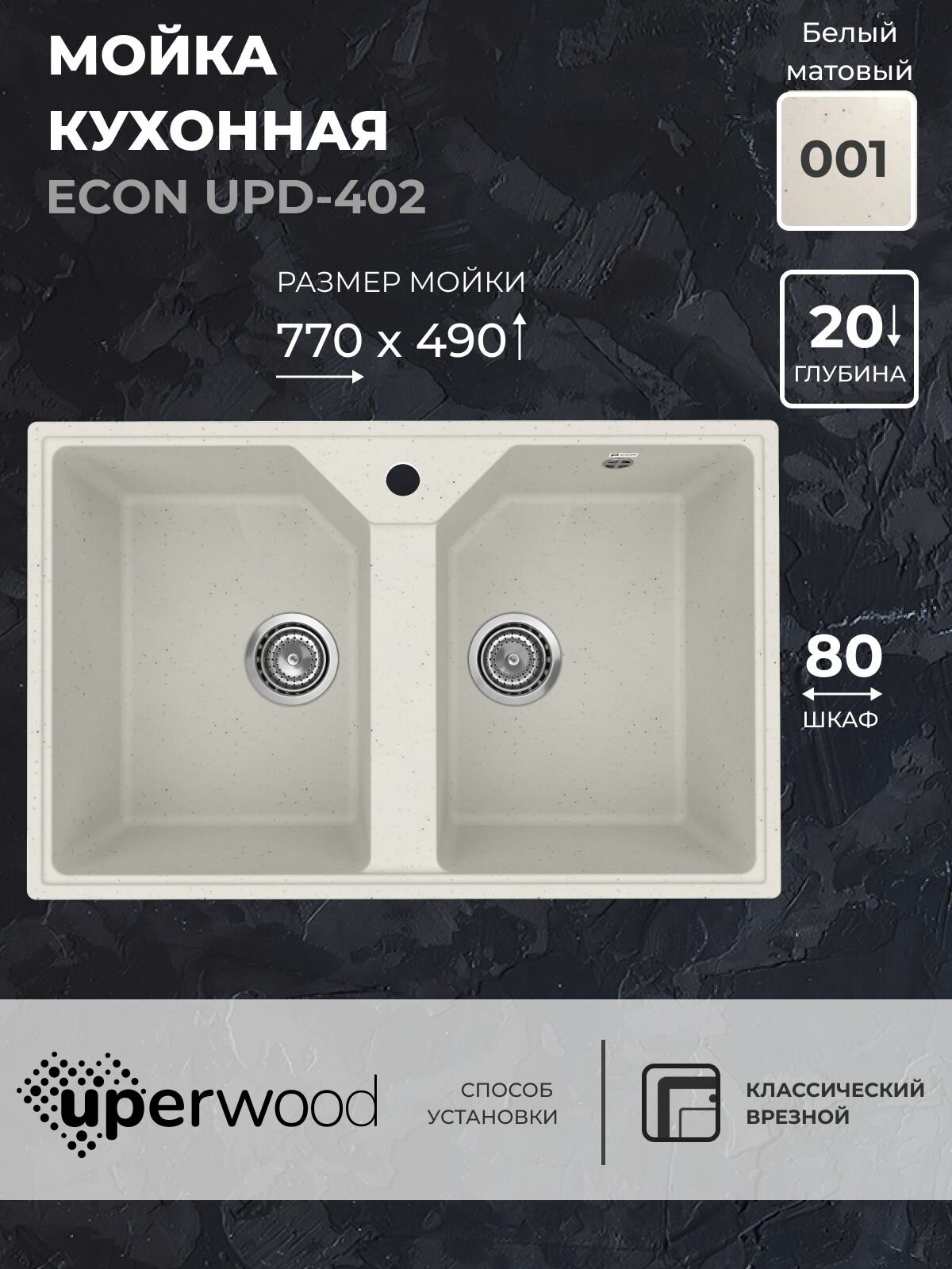 Кухонная мойка из искусственного камня Uperwood ECON UPD-402-001, прямоугольная, 2 чаши, белая матовая интересное: