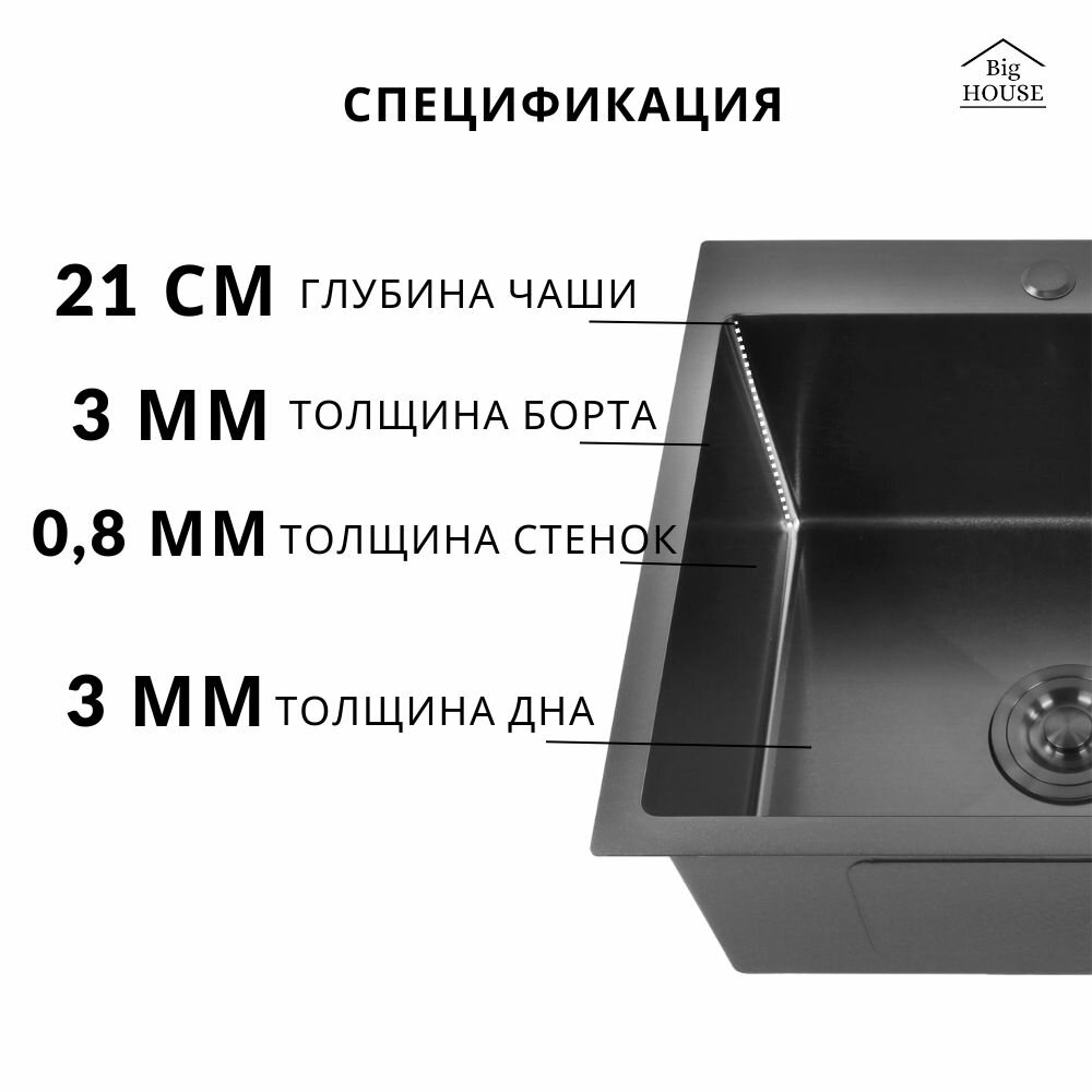 Мойка врезная Big House Двойная 78х43 см, толщина 3,0х0,8 мм, глубина 215 мм, цвет Графит, сифон с переливом + коландер + дозатор